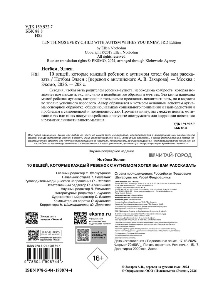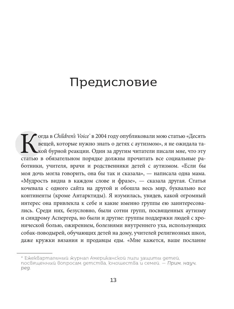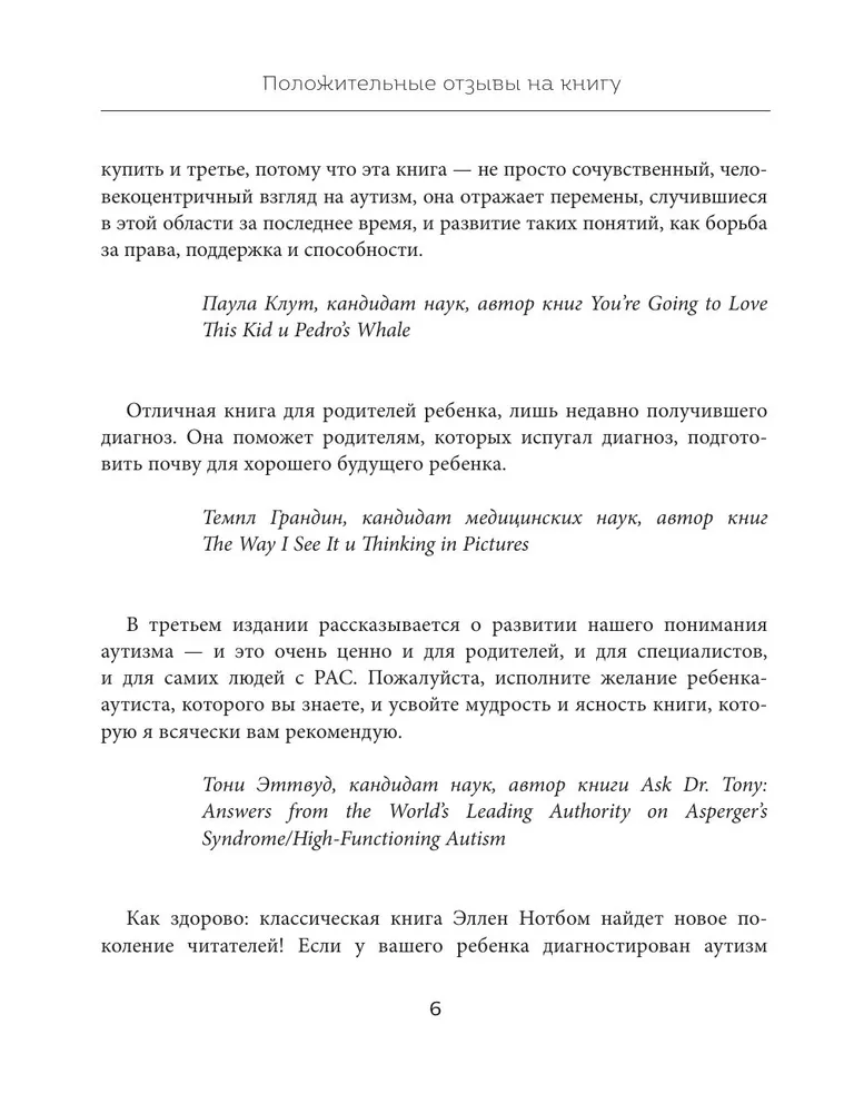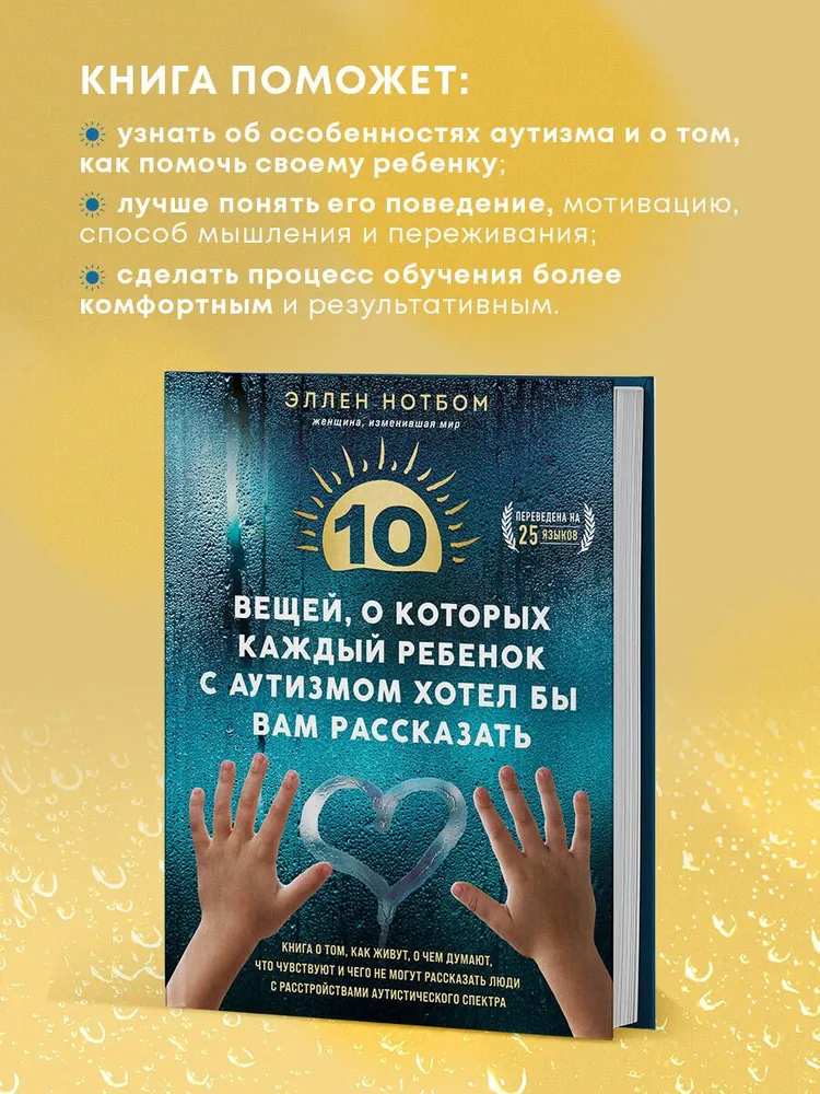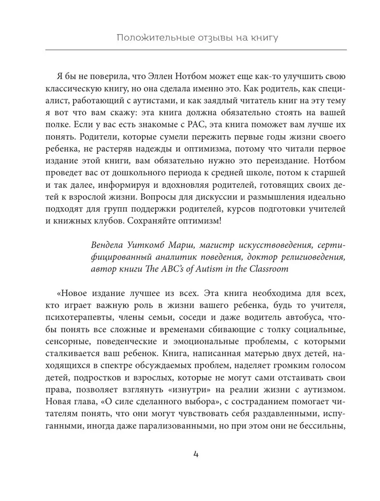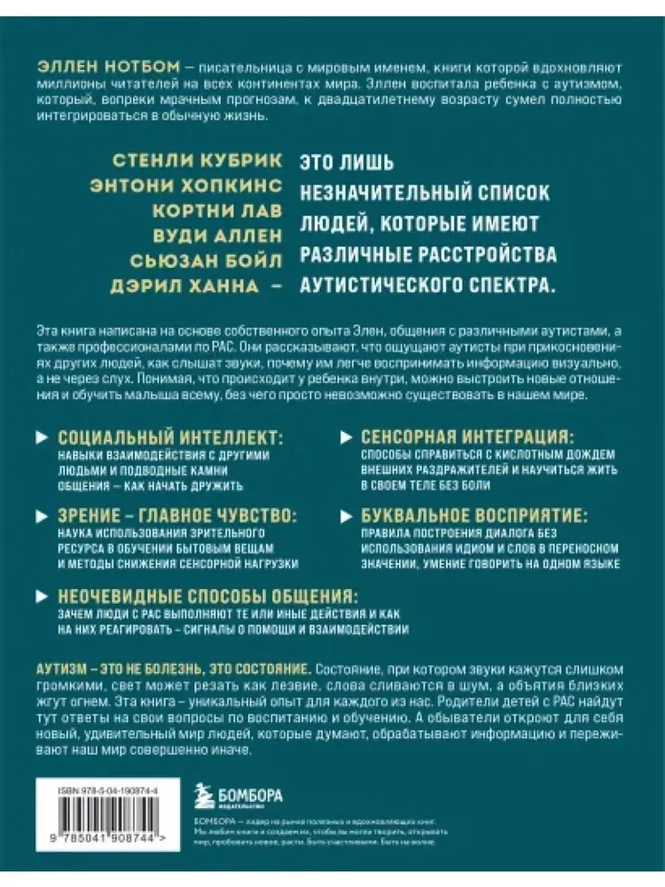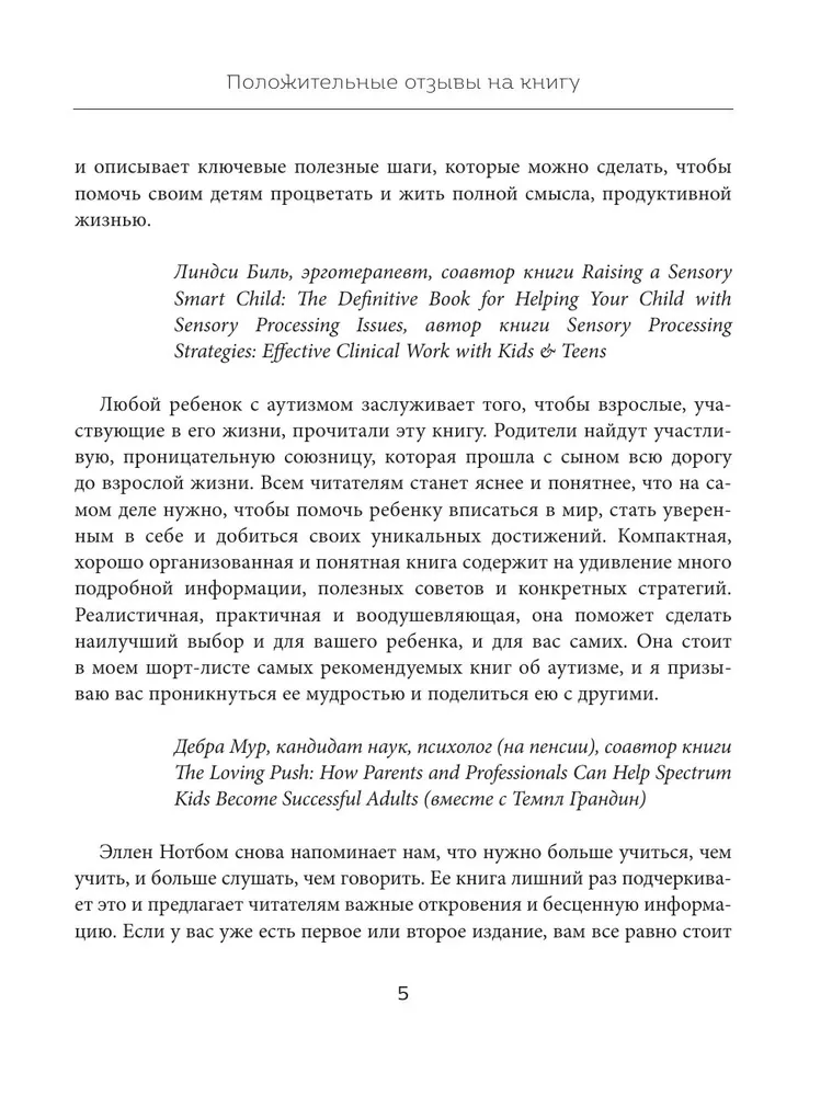 Автор обращается к четырем основным аспектам аутизма: сенсорной обработке, общению, навыкам социального понимания и взаимодействия и проблемам с самооценкой и полноценностью. Прочитав книгу, вы сможете понять мотивацию тех или иных поступков ребенка и получите инструменты для коррекции поведения и развития личности вашего малыша.