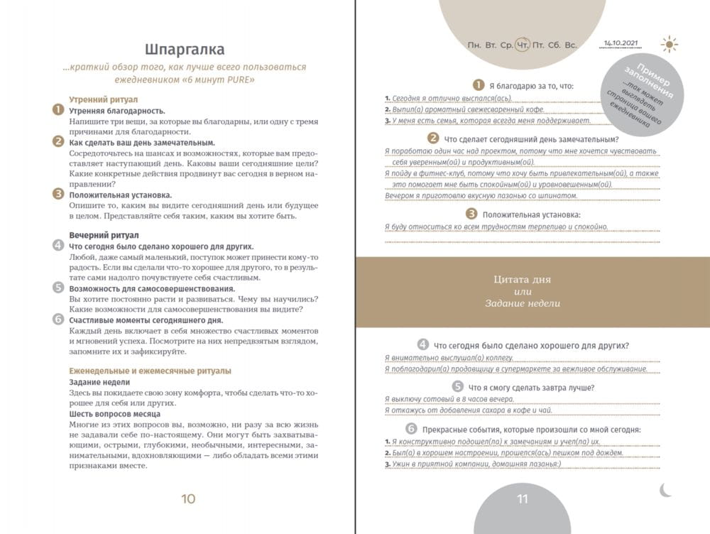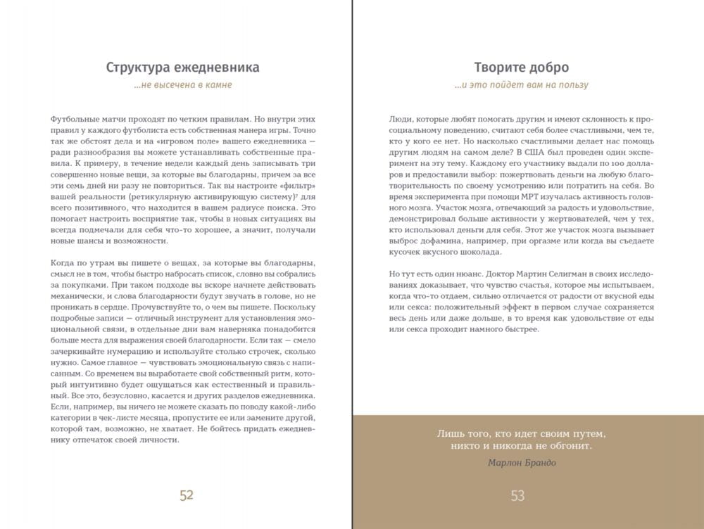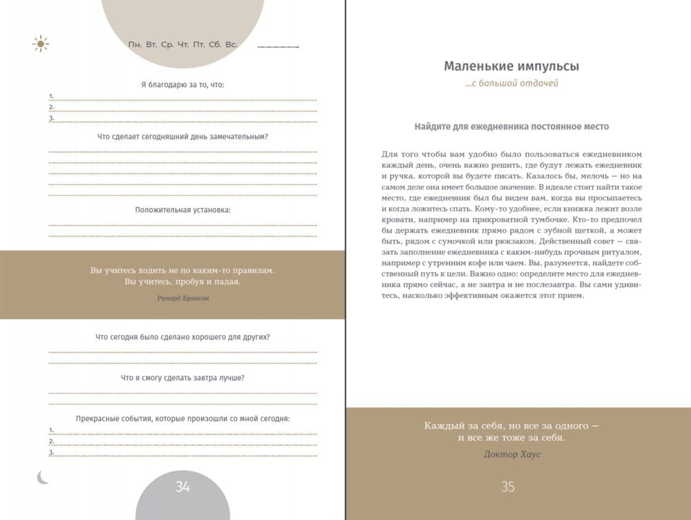 Проверенные на практике принципы позитивной психологии и нейробиологии помогут вам достичь целей, пережить трудные моменты, улучшить отношения с другими людьми и идти по жизни уверенно. С ежедневником вы сможете улучшать свою жизнь постоянно и проактивно, шаг за шагом и каждый день!