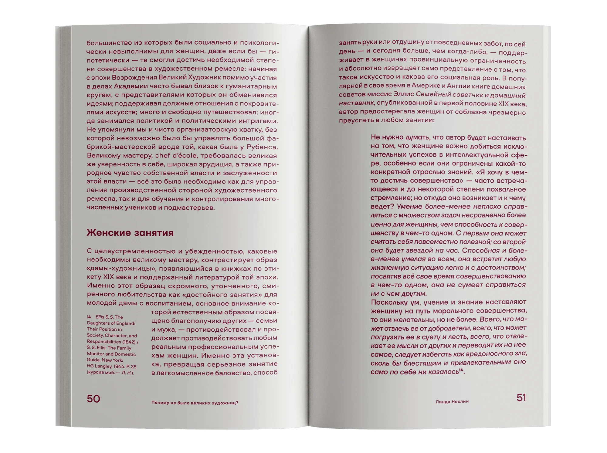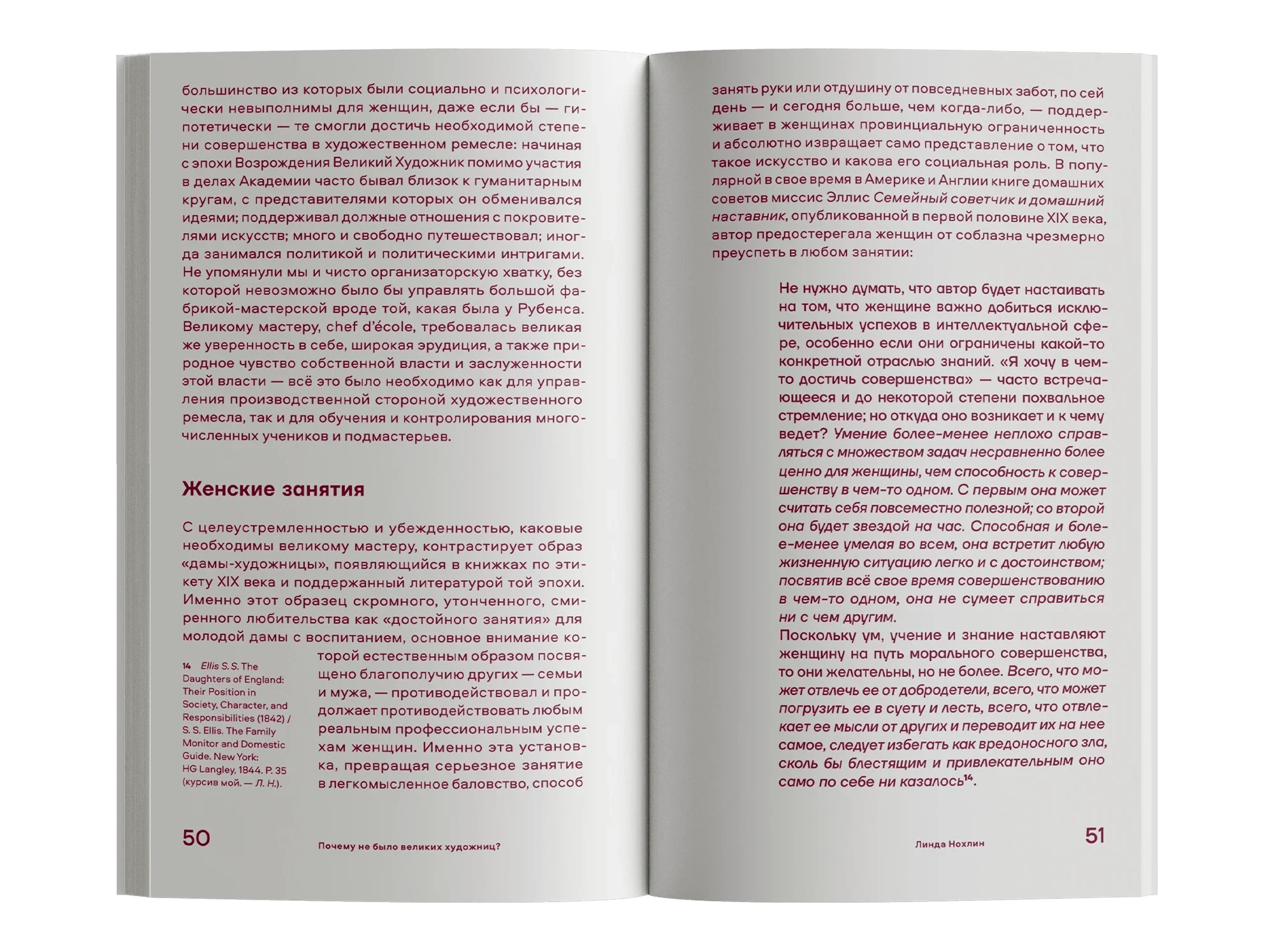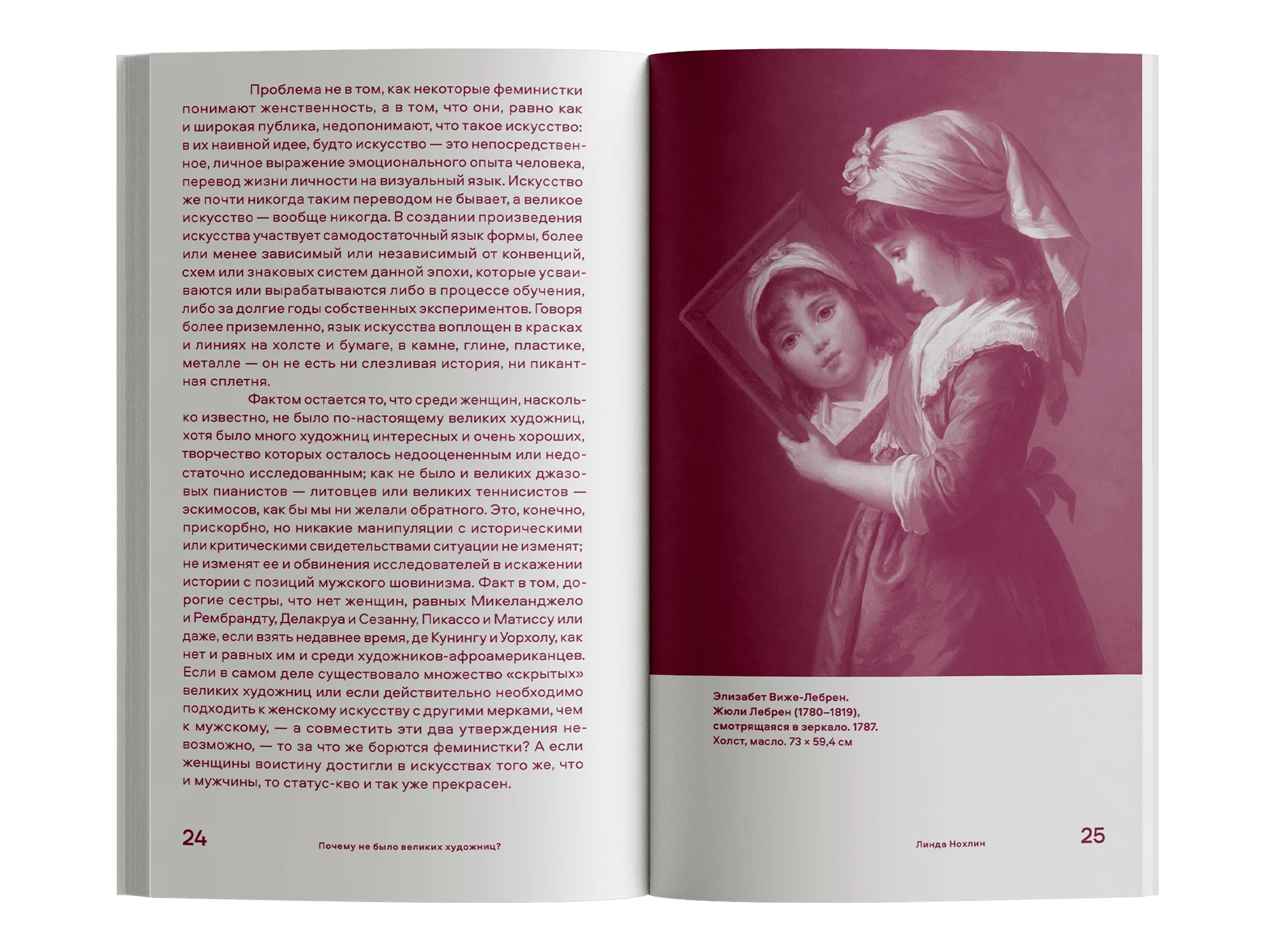 Книга Линды Нохлин «Почему не было великих художниц?» разоблачает миф о мужской «гениальности» в искусстве, анализирует институциональные барьеры для женщин и обсуждает эволюцию положения женщин-художниц сквозь призму феминизма.