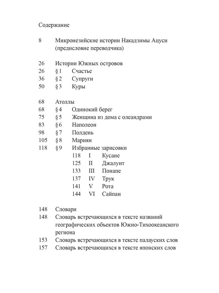 В издание вошли два цикла произведений: «Истории Южных островов» и «Атоллы», где автор, отталкиваясь от личного опыта пребывания в Микронезии в 1941 году, возводит хрупкие мосты между временами и мироощущениями. Накадзима, известный своим переосмыслением китайских легенд, здесь обращается к колониальной тематике, исследуя столкновение культур и природу власти. Первый цикл, «Истории Южных островов», включает притчи и рассказы, вдохновленные местными мифами и преданиями и переплетающиеся с бытом островитян. Второй, «Атоллы», представляет собой лирический дневник странствий, где путевые заметки трансформируются в философские эссе.