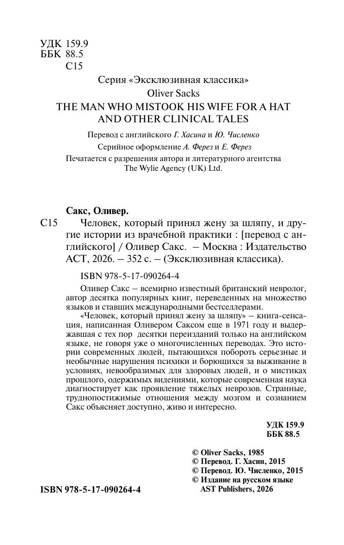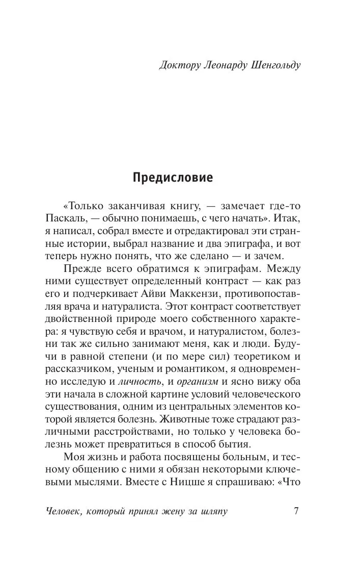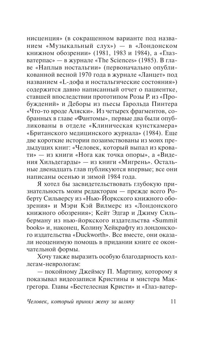 "Человек, который принял жену за шляпу" – книга-сенсация, написанная Оливером Саксом еще в 1971 году и выдержавшая с тех пор десятки переизданий только на английском языке, не говоря уже о многочисленных переводах.