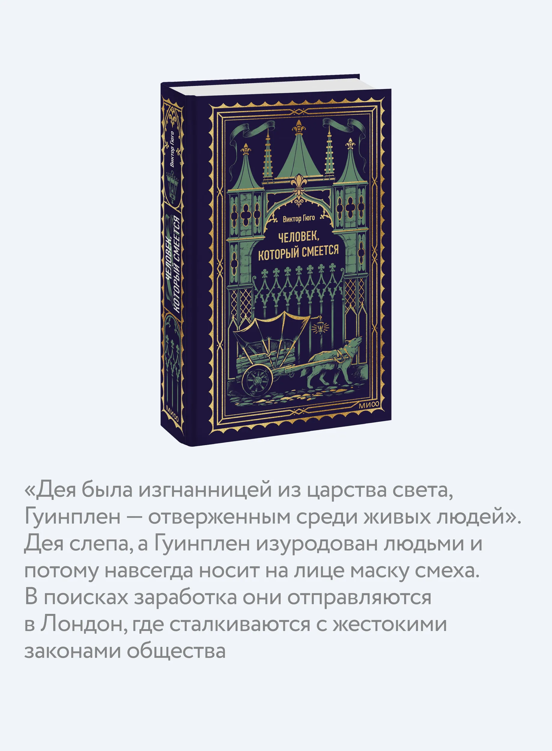 "Дея была изгнанницей из царства света, Гуинплен — отверженным среди живых людей". Дея слепа, а Гуинплен изуродован людьми и потому навсегда носит на лице маску смеха. В поисках заработка они отправляются в Лондон, где сталкиваются с жестокими законами общества.