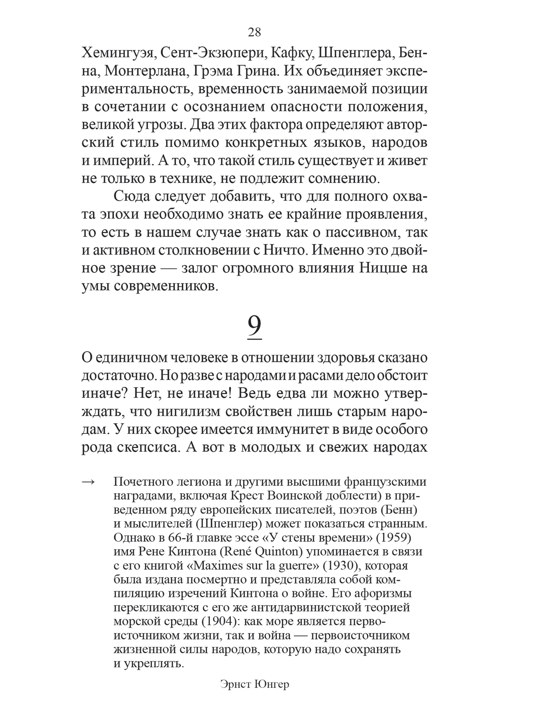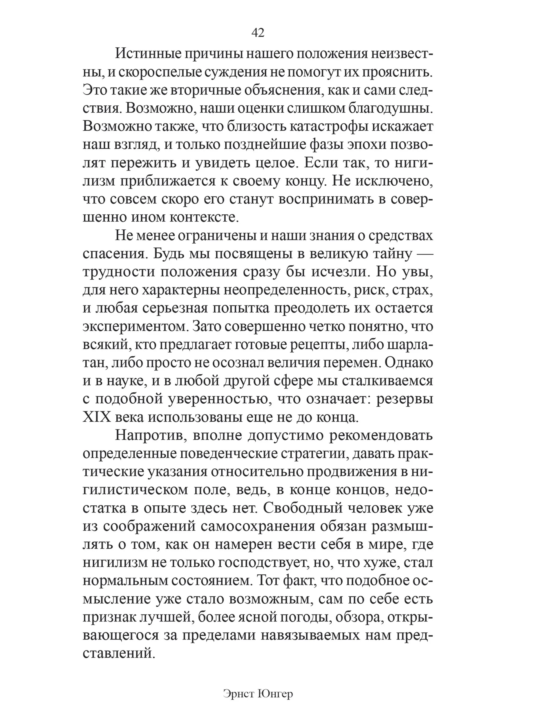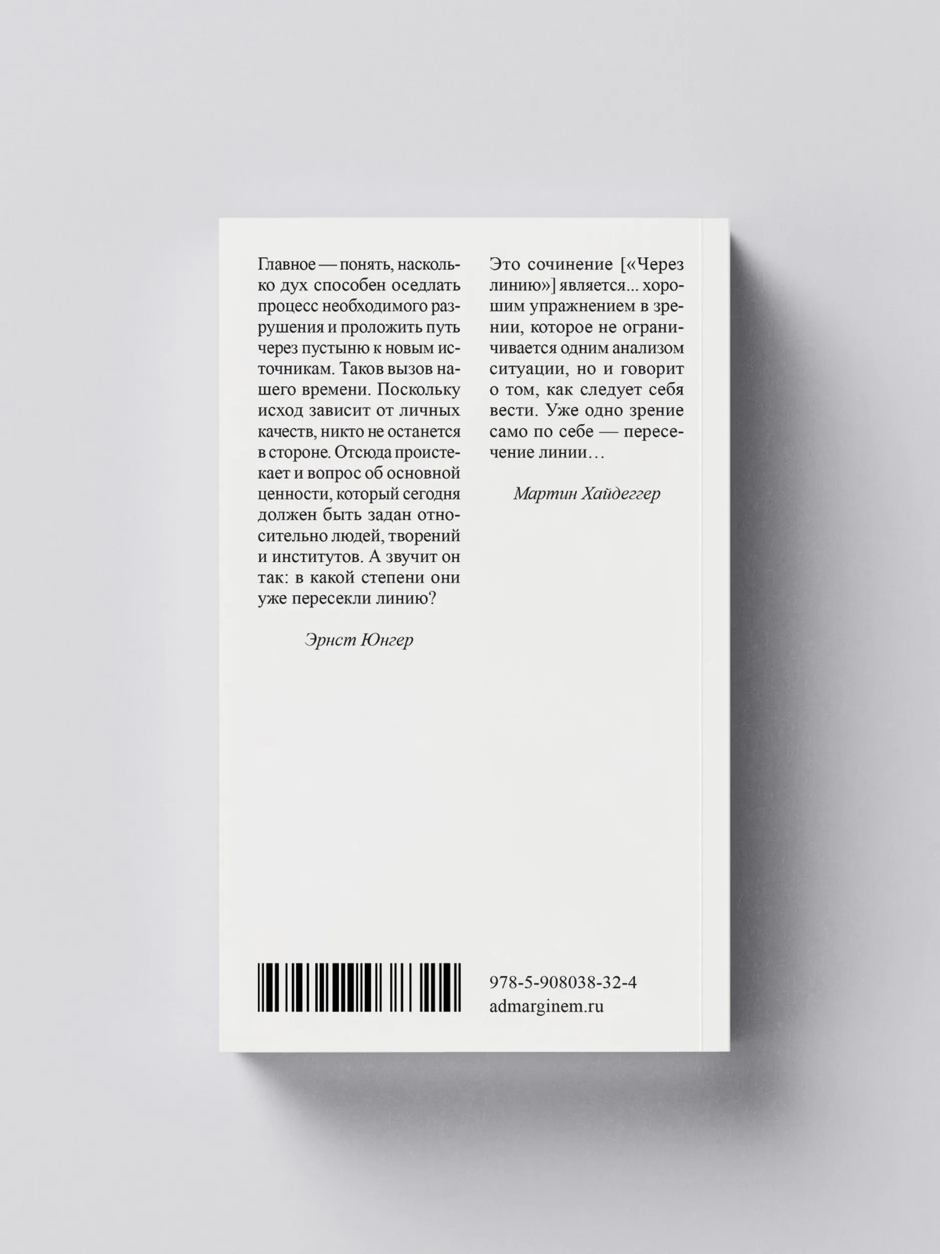 В эссе «Через линию» (1950) Эрнст Юнгер исследует нигилизм как ключевую проблему современности — болезнетворный процесс, охвативший всю планету. Отталкиваясь от идей Достоевского и Ницше, автор предлагает три подхода к проблеме: диагноз, прогноз и терапию. Если в «Рабочем» (1932) Юнгер видел выход в «тотальной мобилизации», то теперь он говорит о необходимости «пересечь линию» — преодолеть нигилизм через личный опыт свободы, в котором откроется «новый поворот бытия». Этот текст — попытка обрести точку опоры в ускоряющемся техническом мире.