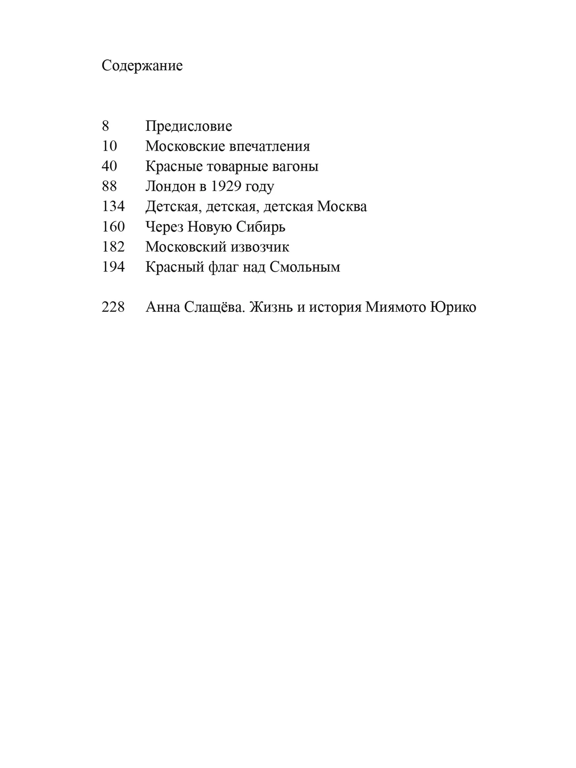Очерки Юрико полны красочных впечатлений от Москвы и Ленинграда, поездки по Транссибирской магистрали до самого Владивостока, а также точных наблюдений о жизни советских граждан, социальном устройстве страны, положении женщин и детей в обществе. Сравнивая СССР с буржуазной Англией, Юрико стремится рассказать своим японским читателям о преимуществах жизни при социализме.
