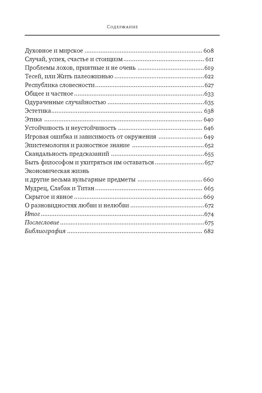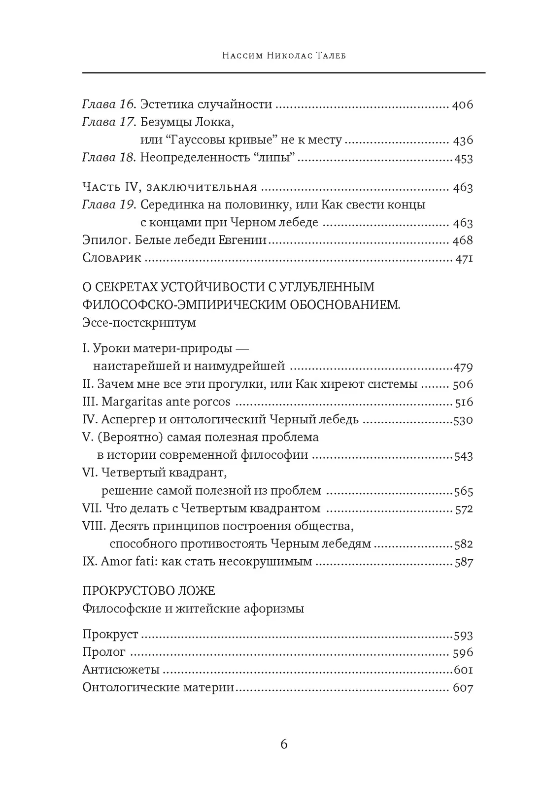 В написанном позже эссе-постскриптуме “О секретах устойчивости” Талеб дает остроумный отпор тем экономистам-ортодоксам, которые приняли созданное им антиучение в штыки. Вошедшее в книгу собрание афоризмов Нассима Талеба — это блестящая квинтэссенция его оригинальных идей.