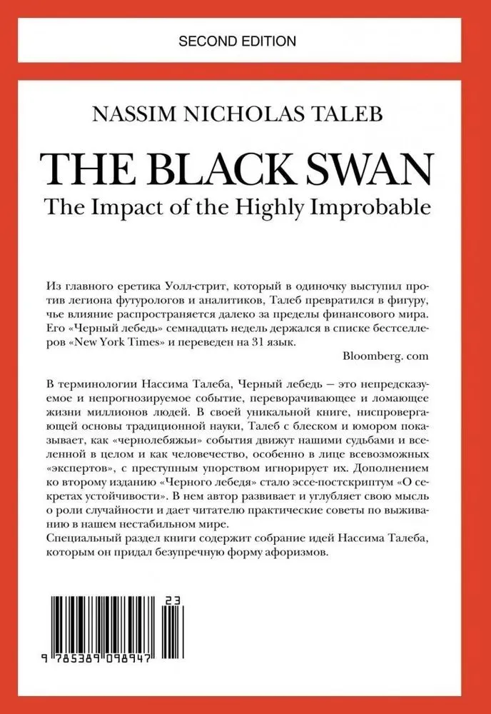 Сразу после выхода “Черного лебедя” автор блестяще продемонстрировал свою “не-теорию” на практике: на фоне финансового кризиса компания Талеба заработала (а не потеряла!) для инвесторов полмиллиарда долларов. Но его труд — не учебник по экономике. Это размышления незаурядного человека о жизни и о том, как найти в ней свое место.