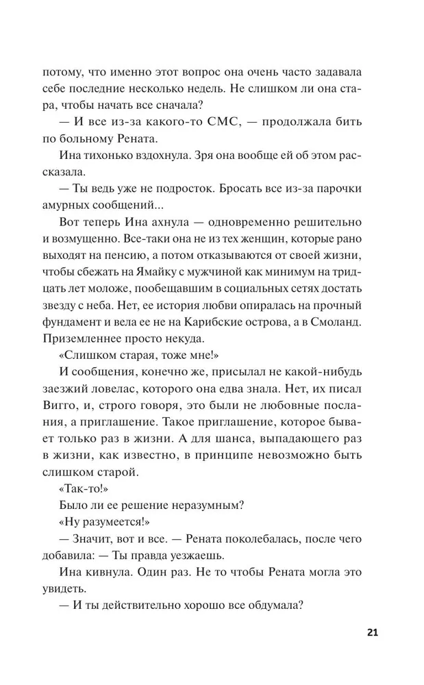 Все в жизни Ины Роденбах пошло под откос. Поэтому, получив письмо от старого знакомого из Швеции, она с радостью принимает его приглашение. Синие озера, бескрайние леса, приятные люди, а рядом – любимый мужчина. Что может быть лучше? Но ее мечты рушатся быстрее, чем можно сказать "не повезло". На ферме Тингсмола Ину встречает вовсе не возлюбленный, а его вдова — и компания бодрых пенсионеров. А когда в округе происходит несколько подозрительных смертей, гостье и вовсе приходится взяться за расследование. Что ж, не зря она прочла столько скандинавских детективов, пока держала книжный магазин.