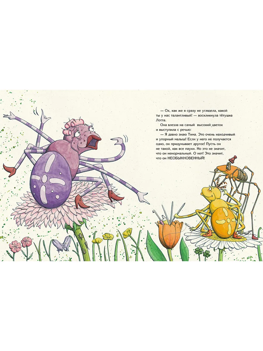 Паучок Тим по прозвищу Длинноножка не такой как все. Он не умеет плести паутину. Из его брюшка не выходит ни одной даже самой тоненькой ниточки. То, что так легко даётся другим его сородичам, для Тима представляется неразрешимой задачей. Ему не помогают никакие советы знающих родственников и знакомых.
