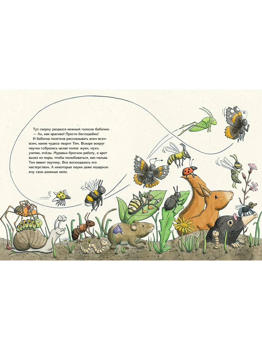 Окружающие уже начинают посмеиваться над Тимом. Они говорят, что впервые видят такого никчёмного паука. Тиму, становится очень обидно, он украдкой плачет в высокой траве, но делать нечего, и ему надо думать, как жить дальше. Вдруг Тим замечает парящий в воздухе обрывок чужой паутины, и ему в голову приходит отличная мысль: «Раз у меня нет своей паутины, попробую сплести что-нибудь из чужой». Тим собирает обрывки паутины, связывает их в длинные нити и хитроумно переплетает между собой. Его сети совершенно не похожи на настоящие паучьи – но всё же это сети, и Тим счастлив, что у него наконец-то начало получаться. Бабочки, муравьи, улитки и пчёлы – все, кто раньше потешался над Тимом и считал его никчёмным, ненормальным пауком, приходят в восторг от столь необычной паутины. «Ах, как красиво! Просто бесподобно!» – восклицают они.