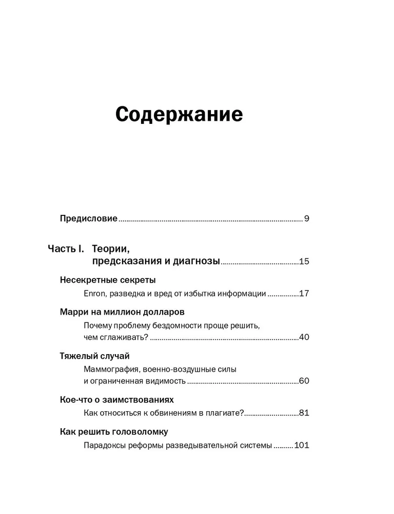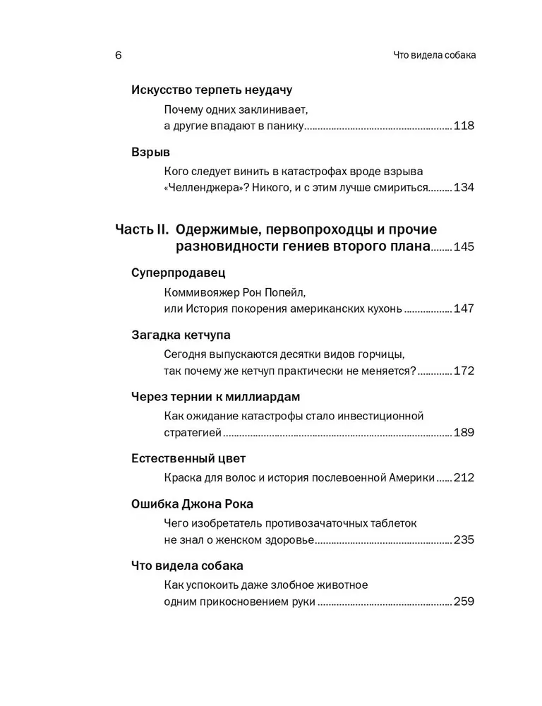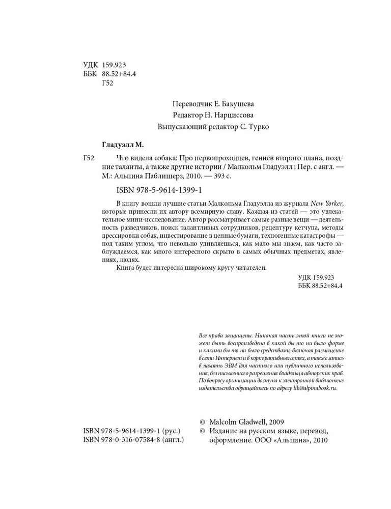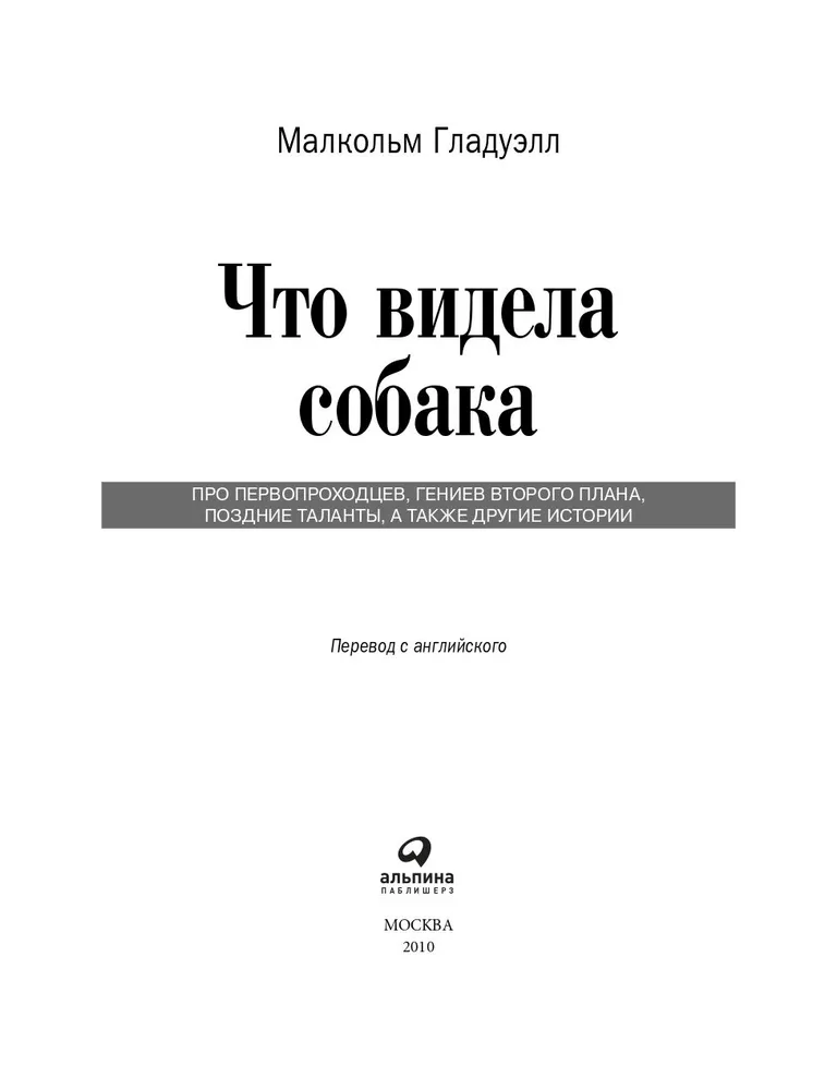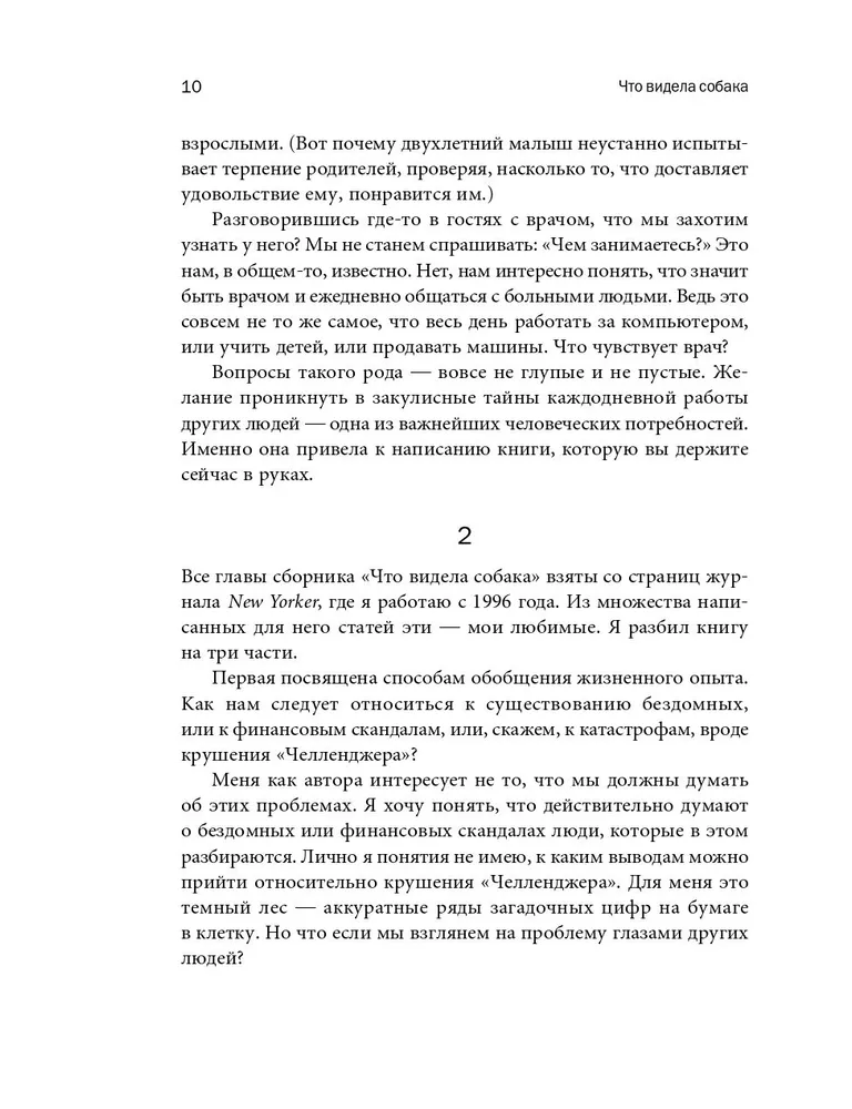 Автор мировых бестселлеров журналист New Yorker Малкольм Гладуэлл рассматривает самые разные вещи — деятельность разведчиков, поиск талантливых сотрудников, рецептуру кетчупа, методы дрессировки собак, инвестирование в ценные бумаги, техногенные катастрофы — под таким углом, что невольно удивляешься, как мало мы знаем, как часто заблуждаемся, как много интересного скрыто в самых обычных предметах, явлениях, людях.