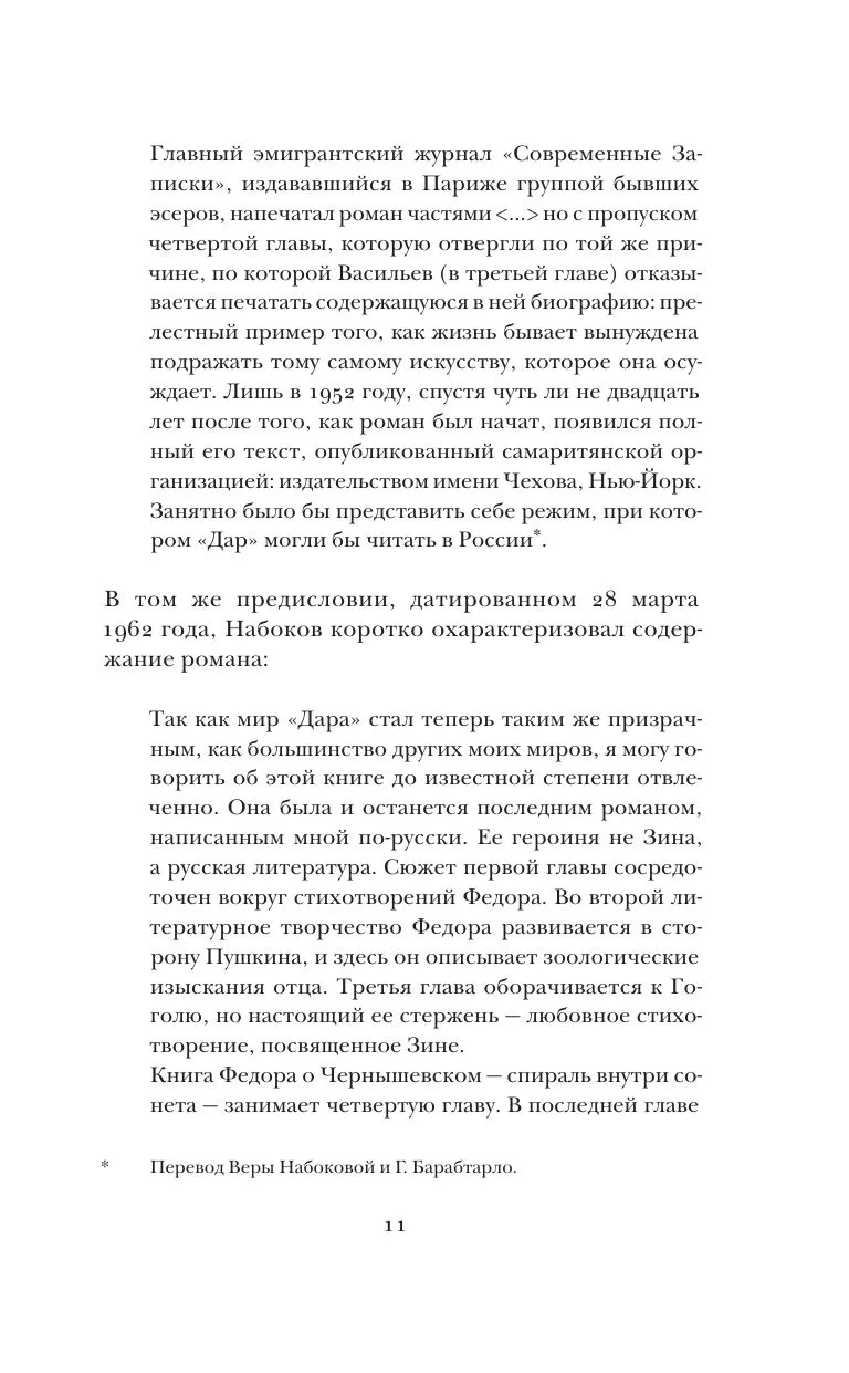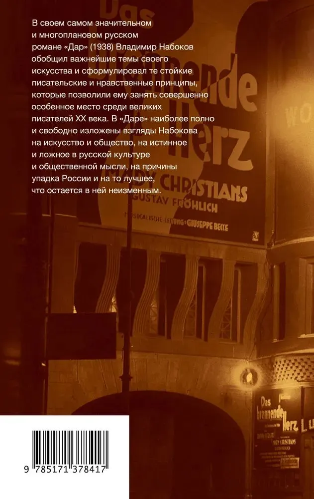 Роман “Дар” – последнее и, возможно, самое совершенное произведение Набокова на русском языке. В центре романа – жизнь молодого русского эмигранта Федора Годунова-Чердынцева в Берлине, его творческий пути и становление как писателя. В глаза тут же бросается совпадение с берлинским периодом самого Набокова, с началом его писательской карьеры под псевдонимом Владимир Сирин. И если в предисловии автор предупреждает, что не стоит сравнивать его с главным героем, то редкий читатель устоит перед игрой “найди десять отличий”.
