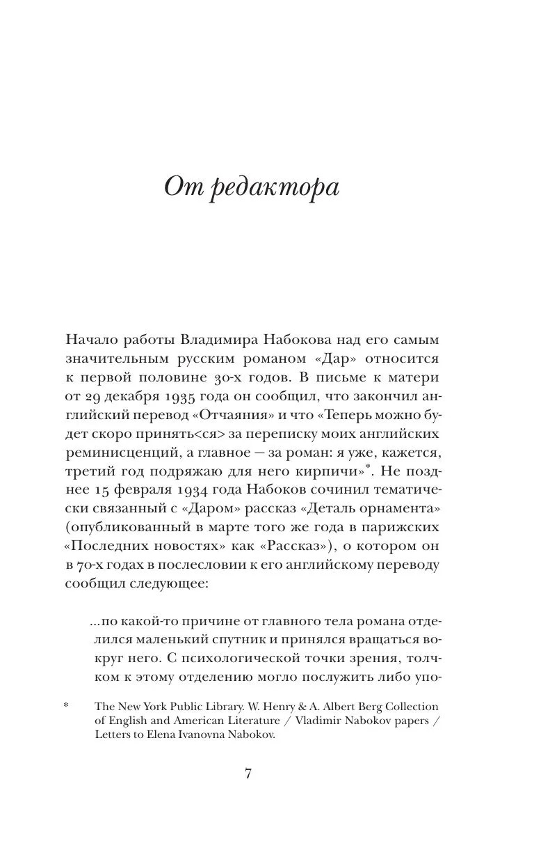 Таким образом, нарочитый отказ от сравнения реальности и вымысла в предисловии – тайное приглашение заглянуть в глубь зеркальных отражений и попробовать разгадать роман “Дар”.