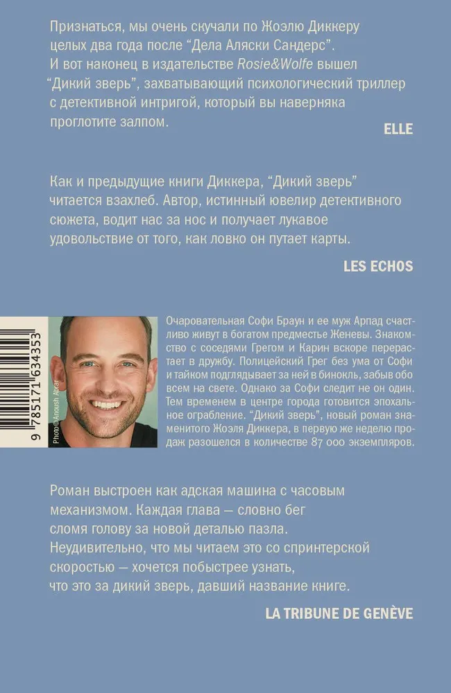 «Дикий зверь» – увлекательный психологический триллер, который будет держать читателей в напряжении до самой последней страницы. 2 июля 2022 года во всех новостях говорят о сенсационном ограблении. Двое неизвестных проникли в ювелирный магазин в центре Женевы и похитили редкие розовые алмазы. За 20 дней до этого в шикарном пригороде Софи Браун готовится отпраздновать свое сорокалетие. Кажется, что у нее просто идеальная жизнь: блестящая карьера адвоката, роскошный дом, успешный и богатый муж, двое детей. Однако вся благополучная жизнь Софи переворачивается с ног на голову, когда в город возвращается человек, с которым она не виделась много лет, и преподносит ей на день рождения весьма необычный подарок…
