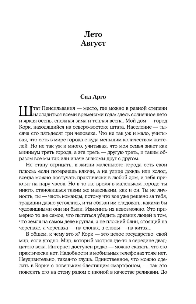 Чем дольше подавляешь боль, тем сильнее она становится. Меня зовут Сид Арго. Мой дом – город Корк, один из самых консервативных и религиозных в штате Пенсильвания. У нас есть своеобразная Библия (её называют Уставом), открыв которую, на первых ста пятидесяти страницах вы увидите свод правил, включающий обязательность молитв, служб и запреты. Запреты на всё. Нельзя громко говорить на улице. Нельзя нарушать комендантский час. Нельзя пропускать религиозные собрания. Нельзя. Нельзя. Нельзя. Ничего нельзя, кроме тайного ощущения собственной ничтожности… Но в самом конце лета в город приезжает новая семья, и что-то начинает неуловимо, но неизбежно меняться. Мое мировоззрение, мои взгляды… Все подвергается сомнению. Ты, Флоренс Вёрстайл, подвергаешь их сомнению. И почему-то я тебе верю.