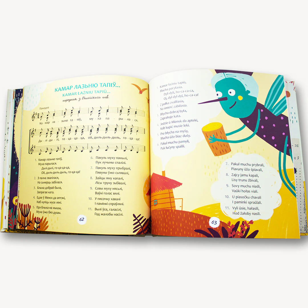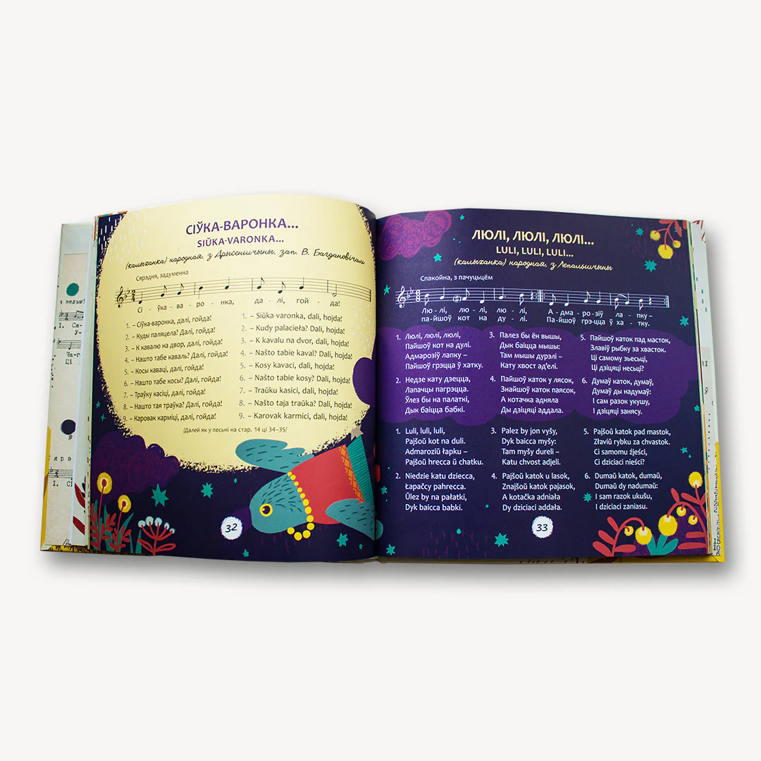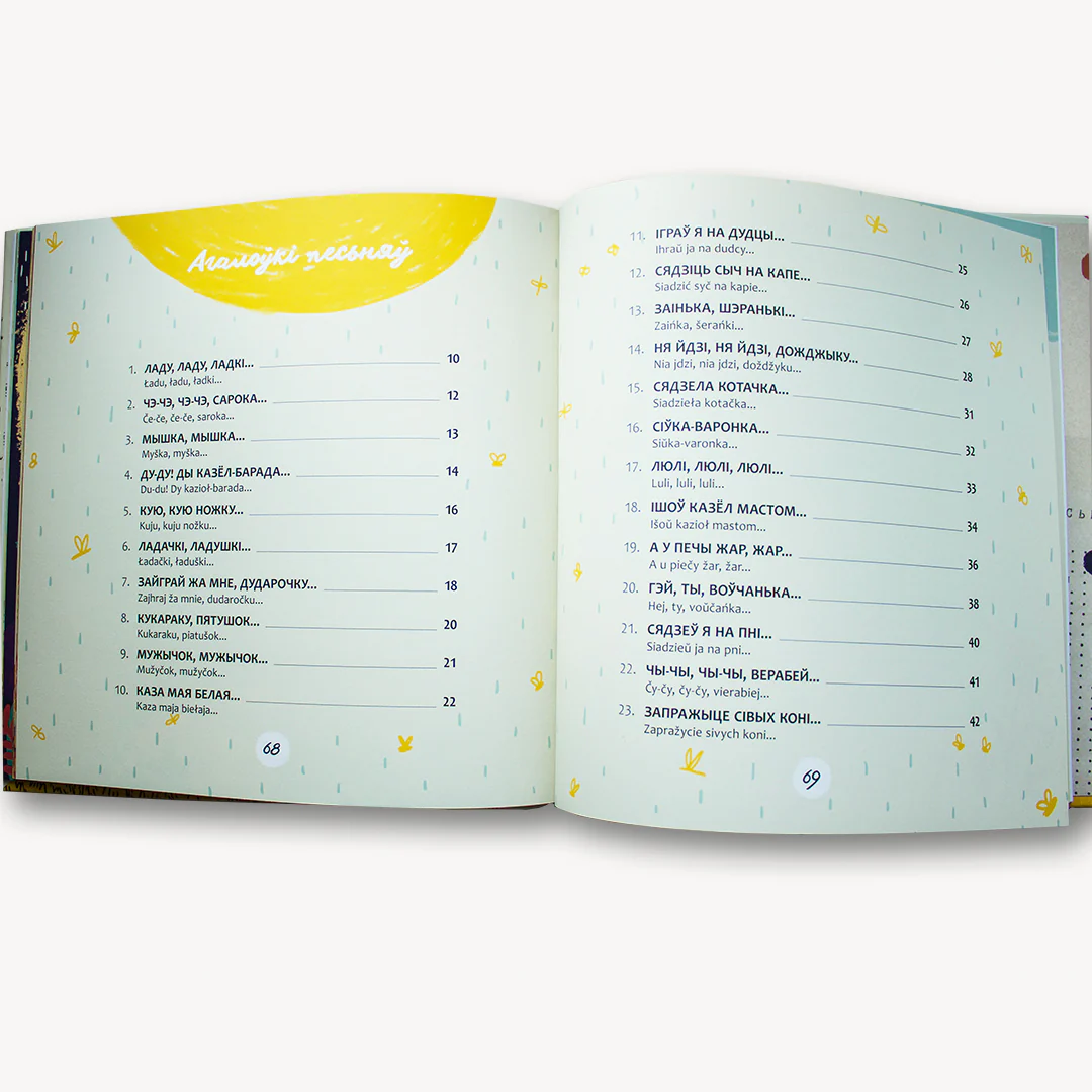 У спеўніку 33 творы з нотамі. Па qr-кодзе можна паслухаць мелодыі песень. Шмат якія тэксты вы абавязкова пазнаеце: у тых ці іншых варыяцыях яны ўваходзяць у беларускія дзіцячыя чытанкі – як вершыкі.