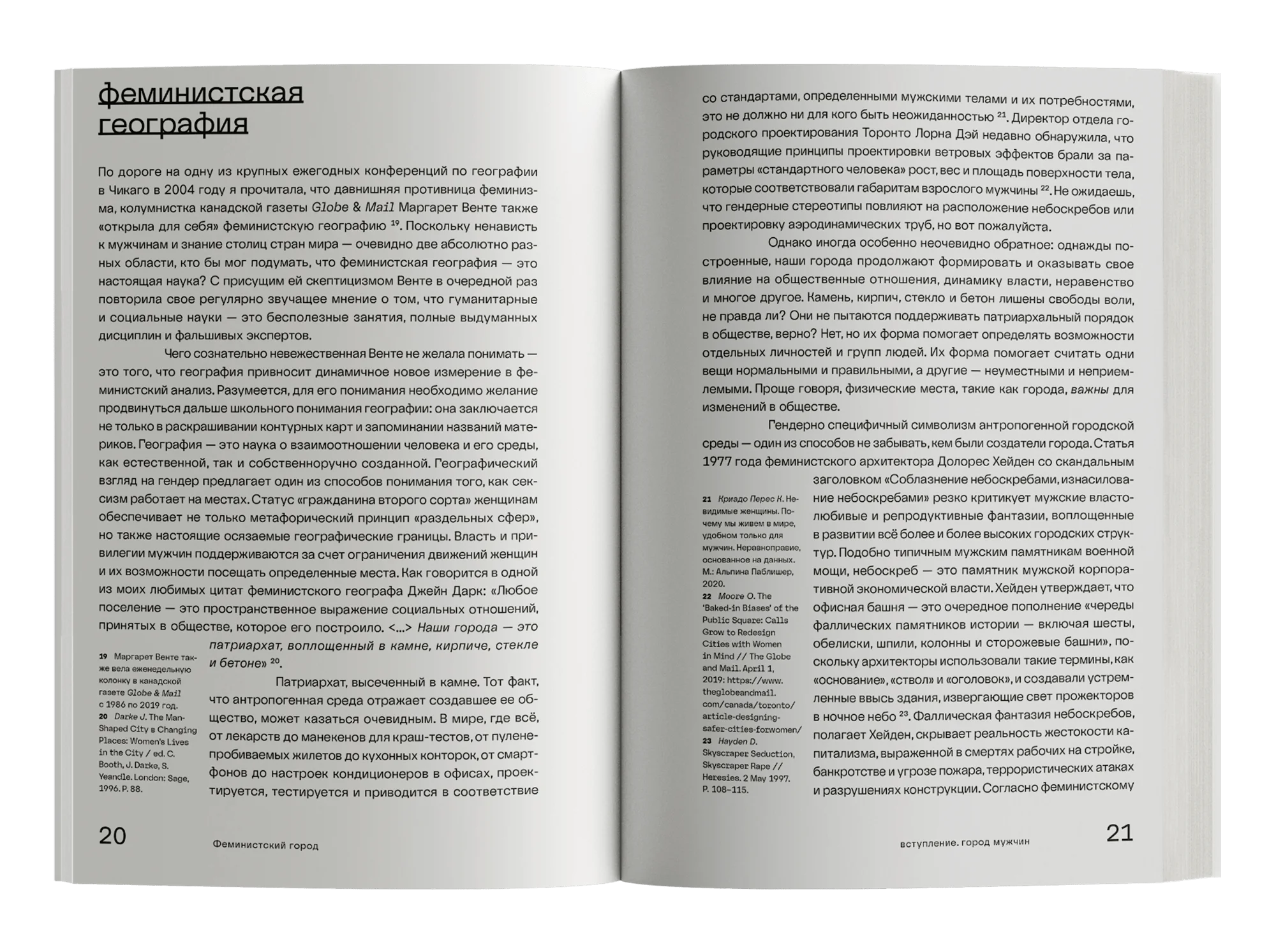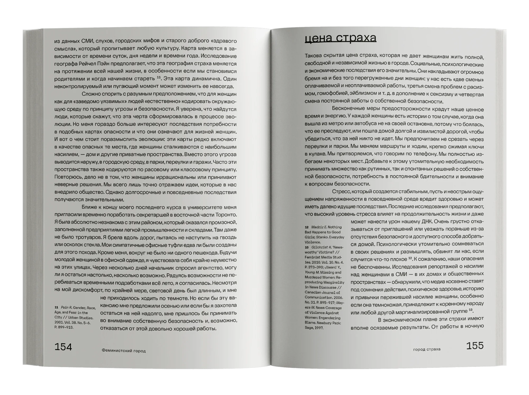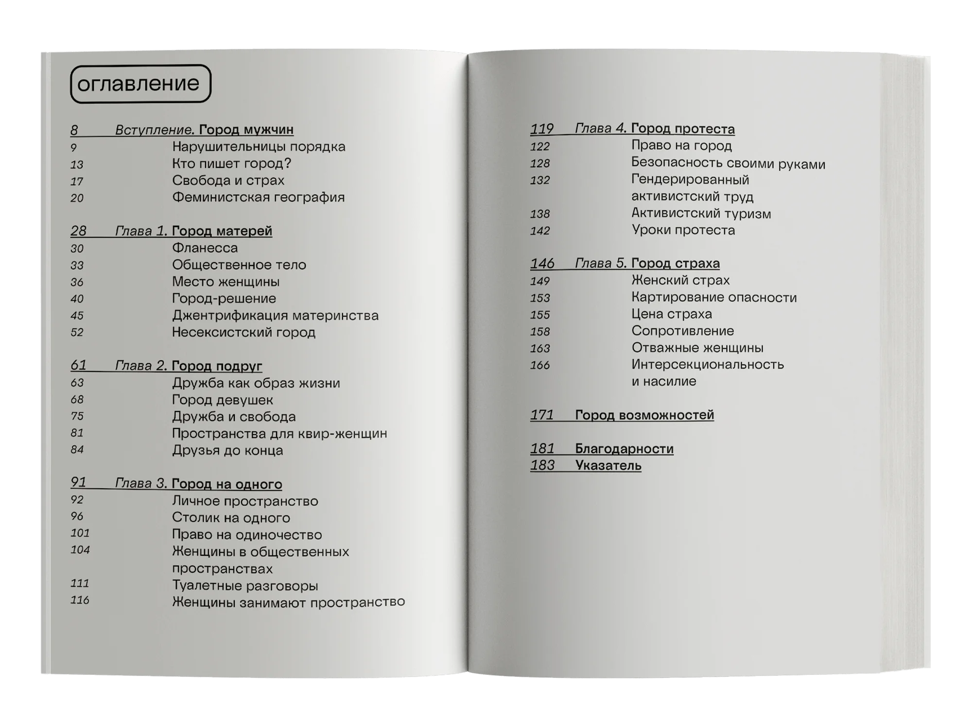 Книга суммирует результаты полевых исследований канадской географини и урбанистки Лесли Керн, занимающейся актуальными вопросами жизни женщин в современном городе. Авторка показывает, насколько структура города — от его планировки до норм и обычаев, регулирующих общение его жителей и жительниц, — превратилась в пространство гендерной борьбы. Описывая собственный опыт материнства, дружбы, работы и активизма, Лесли Керн предлагает применить к городскому планированию интерсекциональный феминистский подход и полагает, что это будет способствовать формированию урбанистики нового поколения.