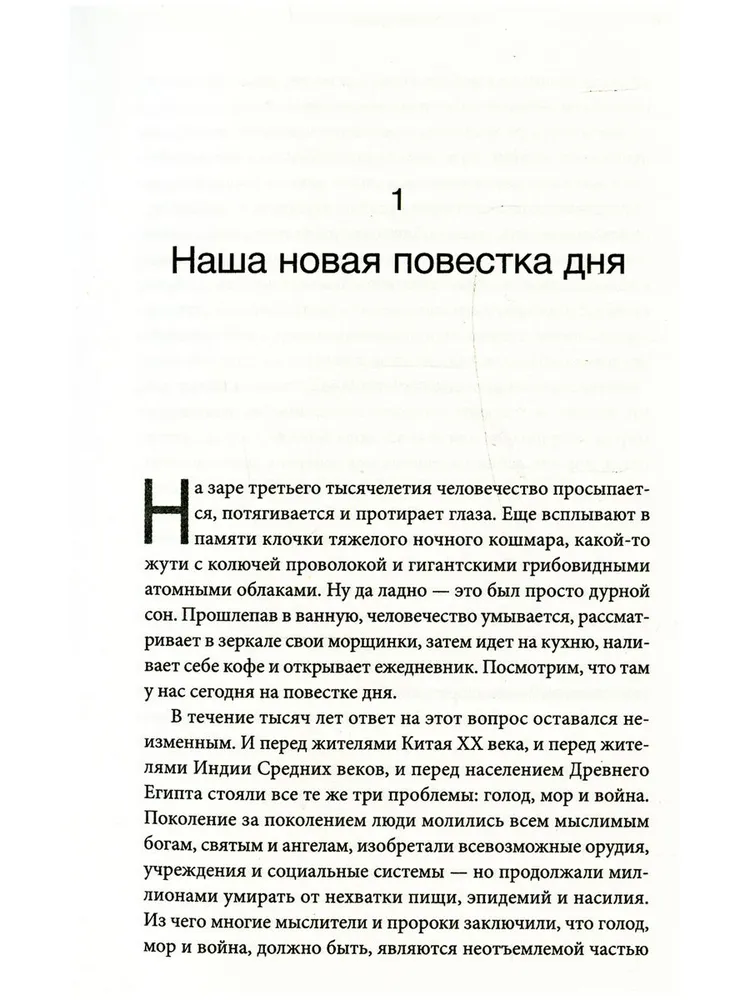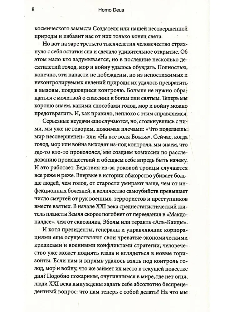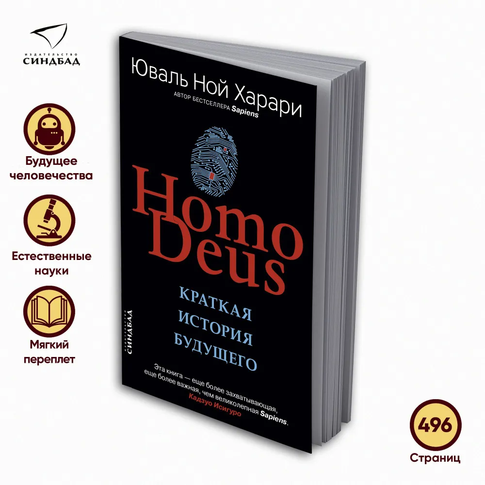 V svoey pervoy knige stavshey vsemirnoy sensaciey "Sapiens Kratkaya istoriya chelovechestva" Yuval Harari rasskazal kak Chelovek Razumnyy prishel k gospodstvu nad nashey planetoy "Homo Deus" yavlyaetsya svoego roda prodolzheniem temy eto popytka zaglyanut v buduschee Chto proizoydet kogda Google i Facebook budut luchshe chem my sami znat nashi vkusy lichnye simpatii i politicheskie predpochteniya? Chto budut delat milliardy lyudey vytesnennyh kompyuterami s rynka truda i obrazovavshih novyy bespoleznyy klass? Kak vosprimut religii gennuyu inzheneriyu? Kakovy budut posledstviya perehoda polnomochiy i kompetenciy ot zhivyh lyudey k setevym algoritmam? Chto dolzhen predprinyat chelovek chtoby zaschitit planetu ot svoey zhe razrushitelnoy sily? Glavnoe seychas polagaet Harari osoznat chto my nahodimsya na perepute i ponyat kuda vedut puti prostirayuschiesya pered nami My ne v silah ostanovit hod istorii no mozhem vybrat napravlenie dvizheniya.