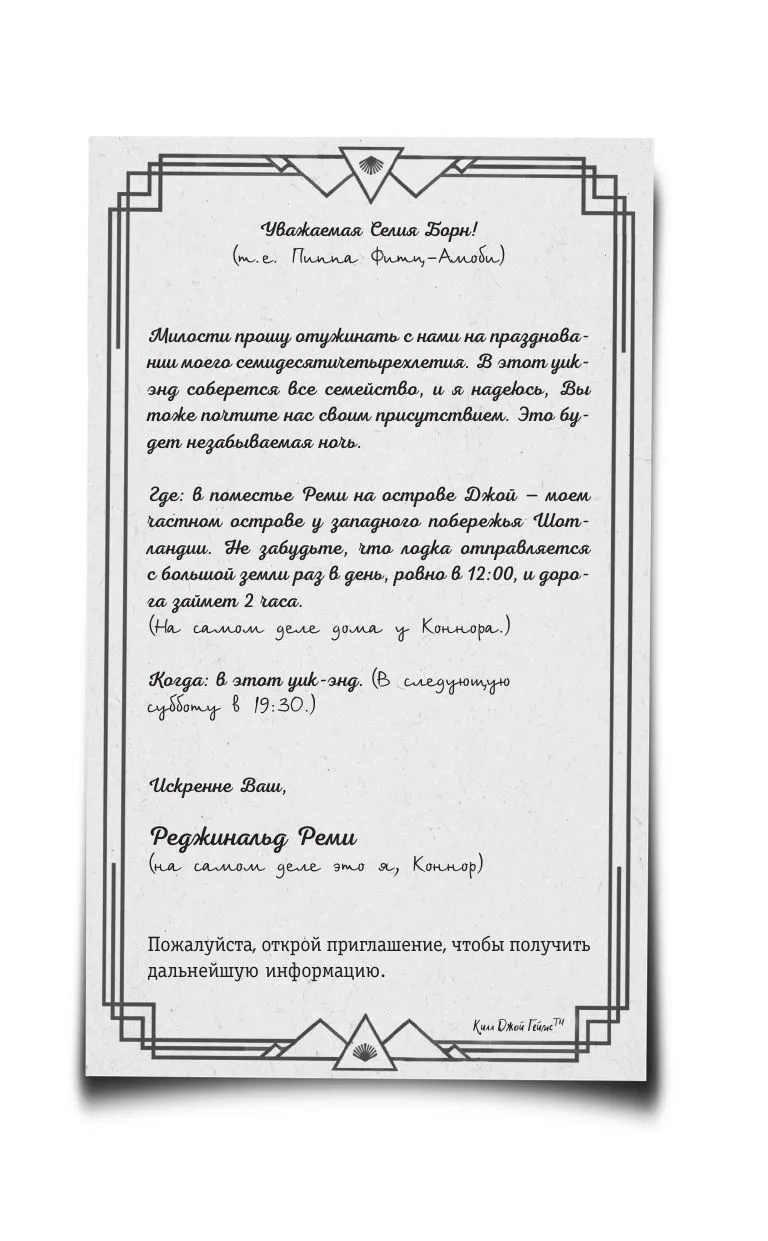 Когда давний друг приглашает старшеклассницу Пиппу Фитц-Амоби принять участие в детективной ролевой игре, девушка поневоле втягивается в расследование загадочного убийства, случившегося на отдаленном шотландском острове одной бурной ночью в 1924 году. Пиппе и ее друзьям предстоит пережить приключение, полное загадок и тайн.