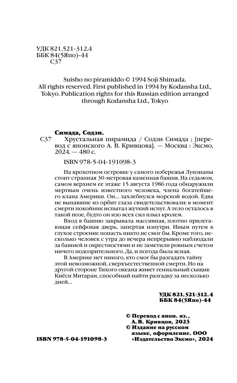 В Америке нет никого, кто смог бы разгадать тайну этой невозможной, сверхъестественной смерти. Но на другой стороне Тихого океана живет гениальный сыщик Киёси Митараи, способный найти разгадку за несколько дней…
