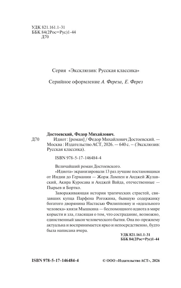 Завораживающая история трагических страстей, связавших купца Парфена Рогожина, бывшую содержанку богатого дворянина Настасью Филипповну и "идеального человека" князя Мышкина — беспомощного идиота в мире корысти и зла, гласящая о том, что сострадание, возможно, единственный закон человеческого бытия. Она по-прежнему актуальна и воспринимается ярко и непосредственно, будто была написана вчера.