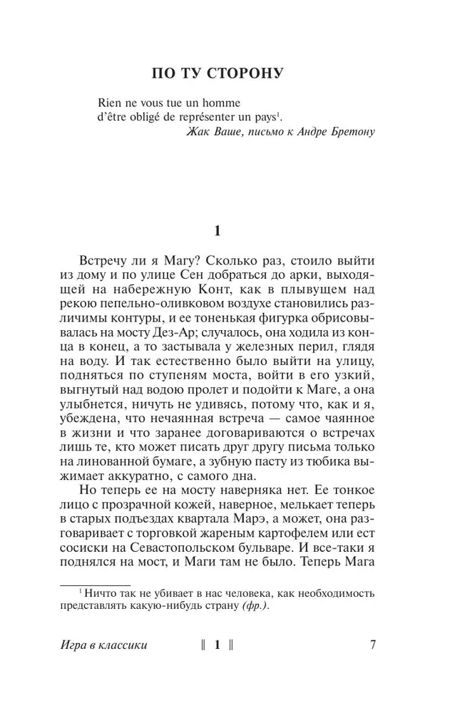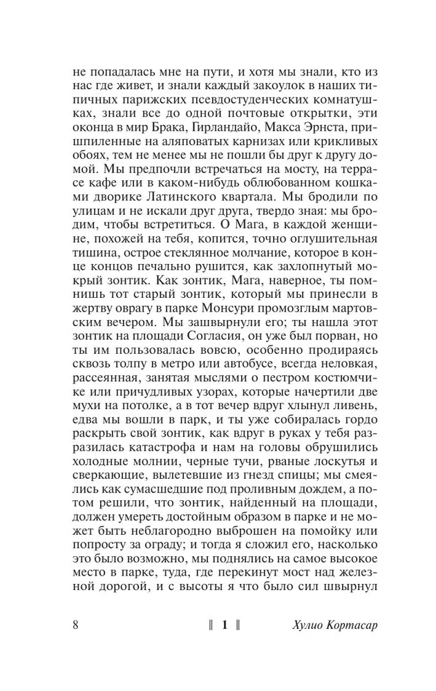 Экспериментальный роман аргентинского автора Хулио Кортасара «Игра в классики» чрезвычайно похож на описанное развлечение...Читать поток размышлений главного героя Орасио Оливейры, который презирает общество и страдает от одиночества, можно по-разному. Или как обычную книгу из двух частей — «По ту сторону» и «По эту сторону». Или по главам — по схеме, которую предлагает Кортасар в предисловии, прыгая от одной части к другой, как в классиках. И тогда в романе возникает новый уровень восприятия, который делает читателя соучастником автора, заставляя его домысливать, заполнять пробелы, выбирать сюжетные ходы...Важнее сюжета романа — чувство игры. Ни один писатель не играл лучше, чем Кортасар. © The Boston Globe «Игра в классики»: книга, которую литературные критики традиционно сравнивают то с «Игрой в бисер» Германа Гессе, то с «Улиссом» Джеймса Джойса. Книга, считающаяся своеобразным эталоном магического реализма. «Игра в классики». Текст в тексте. Роман, в котором мистические откровения подлежат жесткой классификации, а обычные события обретают глубинный, многоуровневый смысл. Книга, без которой не было бы не только Фаулза и Коэльо, но даже и «позднего» Маркеса!