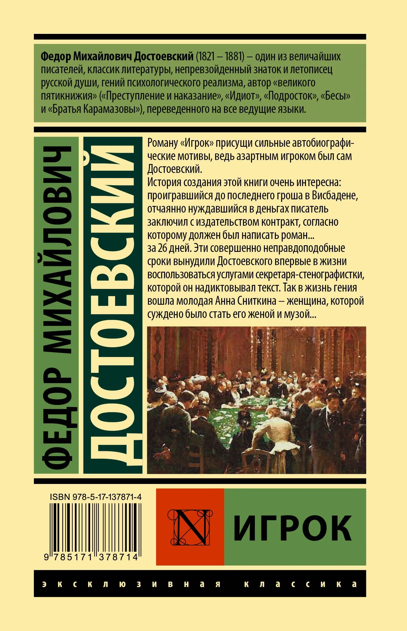 Роману "Игрок" присущи сильные автобиографические мотивы, ведь азартным игроком был сам Достоевский. История создания этой книги очень интересна: проигравшийся до последнего гроша в Висбадене, отчаянно нуждающийся в деньгах писатель заключил с издательством контракт, согласно которому должен был написать роман за 26 дней.