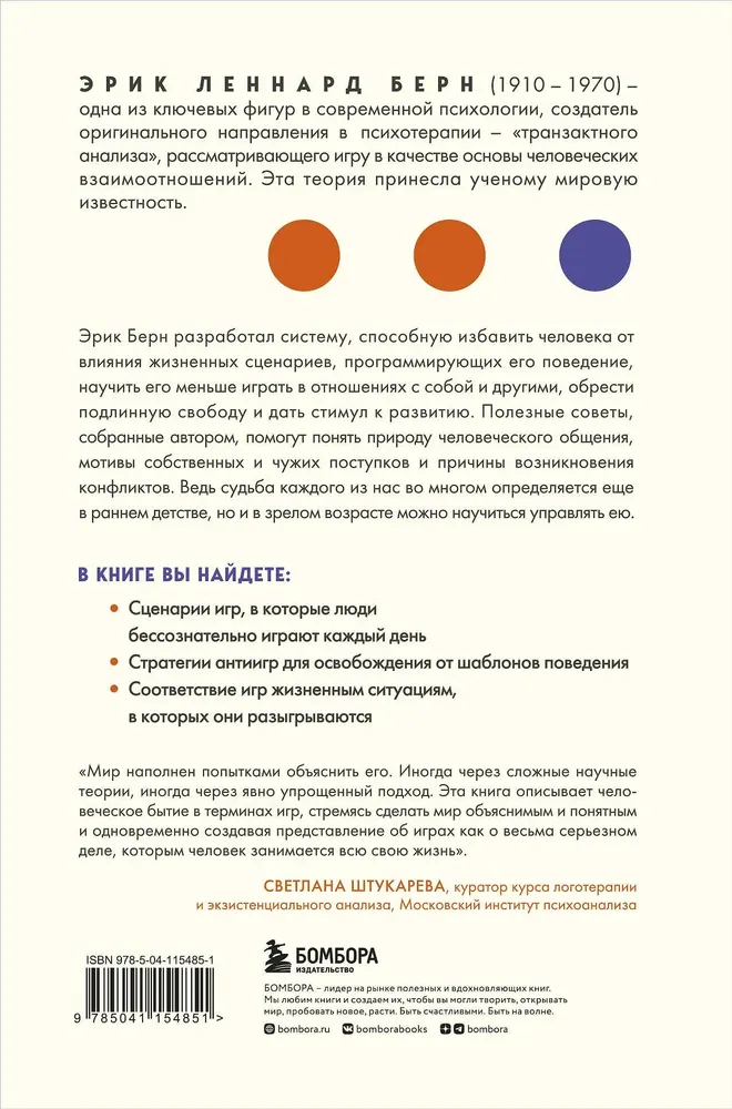 Перед вами легендарный бестселлер по психологии человеческих взаимоотношений, переизданный с новой научной редактурой. Эрик Берн разработал систему, способную избавить человека от влияния жизненных сценариев, программирующих его поведение, научить его меньше играть в отношениях с собой и другими, обрести подлинную свободу и побудить к личностному росту.