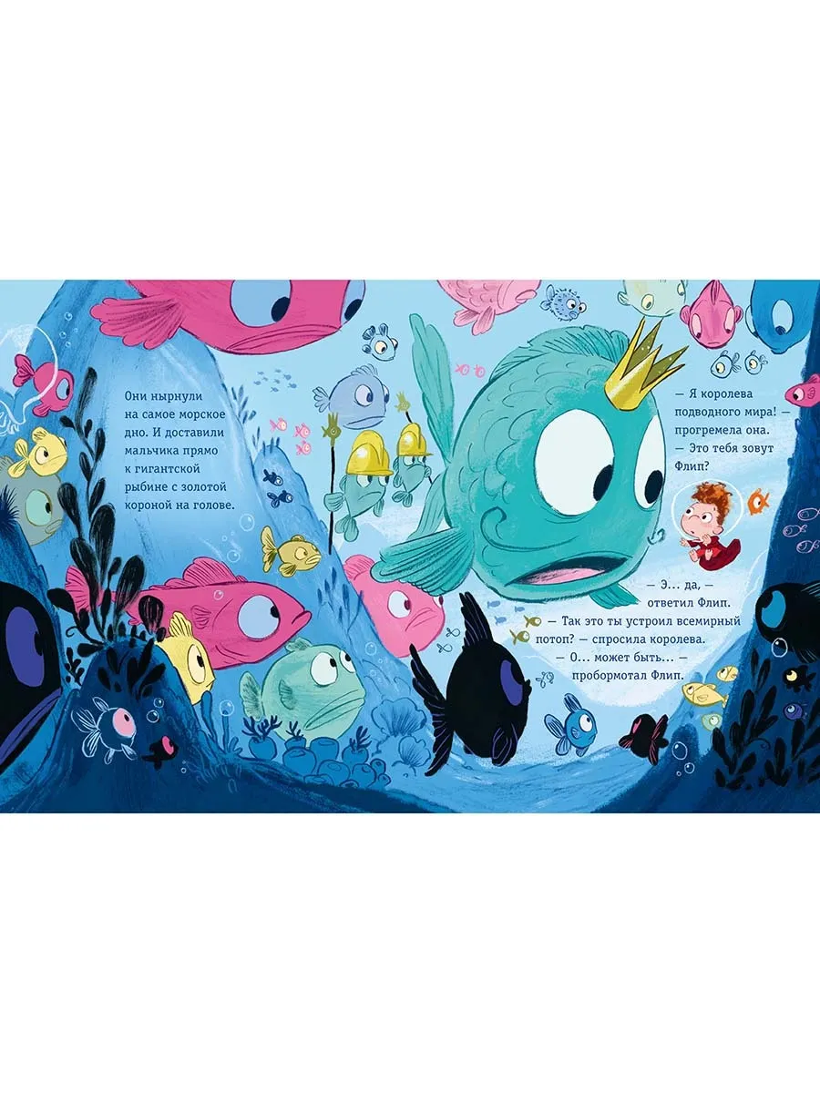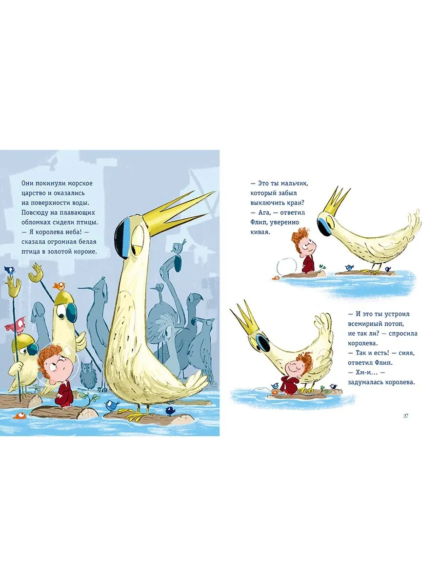 И вот, пока Флип спал, вода заполнила сначала ванную комнату, потом весь дом, и в конце концов вся улица и весь город скрылись под водой. Флип устроил всемирный потоп! И что же было дальше?