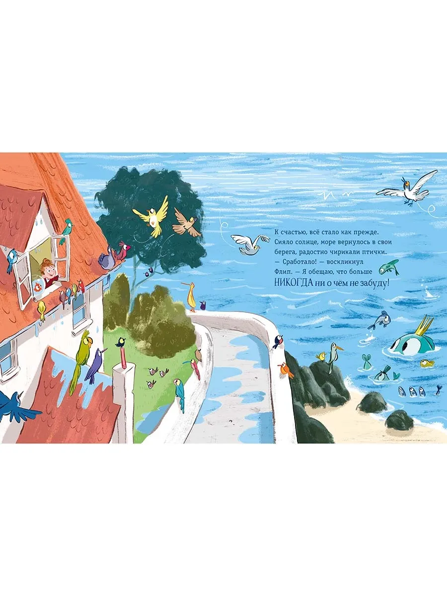 Рыбы и другие морские обитатели были счастливы. Они не знали, как отблагодарить Флипа и провозгласили его своим героем. А вот животные и птицы, напротив, были не в восторге от нового положения дел. Вода покрыла даже горы, так что всем им стало негде жить и нечего есть. И когда Флип понял, что натворил, он немедленно кинулся всё исправлять. Он нырнул поглубже, отыскал под водой свою улицу и свой дом и вынул пробку из раковины! После этого всё в мире стало как прежде… ну или почти.