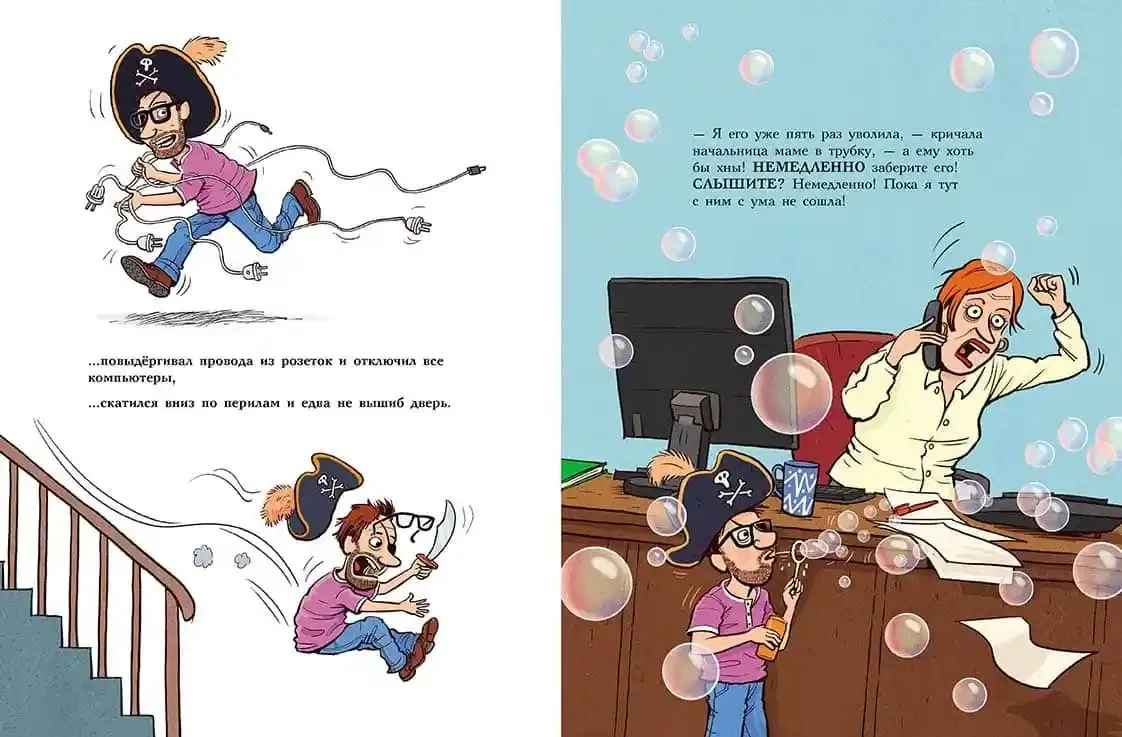 Откуда ему было знать, что как раз в это время мимо проходила добрая фея... Фея исполнила папино желание, и наутро он проснулся пятилетним сорванцом. От взрослого папы у него остались только борода и очки. В тот же день у себя на работе папа перевернул всё вверх дном, и начальница его, разумеется, выгнала. Пришлось маме отдать папу в детский сад, куда ходит Тина. И папе там очень понравилось.