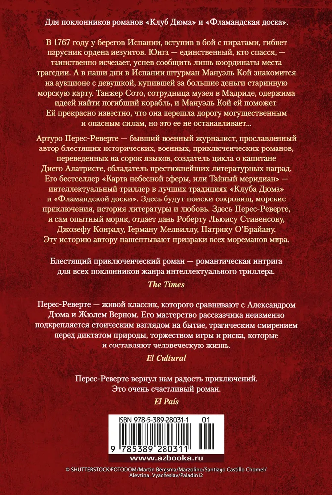 Артуро Перес-Реверте — бывший военный журналист, прославленный автор блестящих исторических, военных, приключенческих романов, переведенных на сорок языков, создатель цикла о капитане Диего Алатристе, обладатель престижнейших литературных наград. Его бестселлер «Карта небесной сферы, или Тайный меридиан» — интеллектуальный триллер в лучших традициях «Клуба Дюма» и «Фламандской доски». Здесь витают призраки всех мореманов мира. Здесь Перес-Реверте, и сам опытный моряк, отдает дань Роберту Льюису Стивенсону, Джозефу Конраду, Герману Мелвиллу, Патрику О’Брайану. Здесь морские приключения неотделимы от истории, литературы и любви.