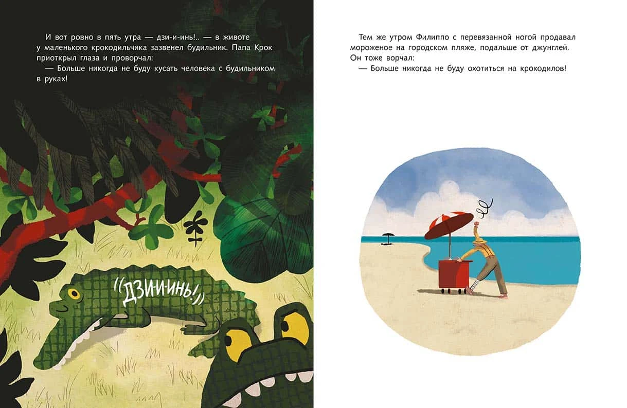 Однажды маленький крокодильчик случайно проглотил будильник, который выпал из рук охотника на крокодилов. С тех пор ровно в пять утра в джунглях – дзи-и-инь! –раздавался звон будильника, и это не нравилось решительно никому. Перепуганные цапли взмывали в воздух, обезьяны карабкались на верхушки деревьев, лягушки с кваканьем бросались врассыпную. «Какой кошмар! Опять этот Крокодильник!» – ворчали все. Ведь с тех пор, как крокодильчик проглотил этот проклятый будильник, его так и прозвали – Крокодильник. Бедняге Крокодильнику и самому жилось несладко. В животе у него все время громко тикало – тик-так, тик-так, тик-так – поэтому тихо подкрасться к добыче и как следует поохотиться у него никак не получалось. Видя, что все ополчились против него, Крокодильник решил уйти из дома. Путешествие пошло ему на пользу и помогло решить проблему с будильником. Правда, теперь, эта проблема стала беспокоить кое-кого другого.