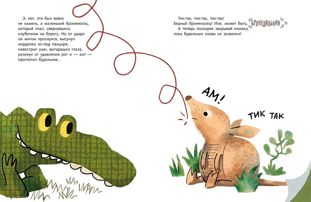 В текст встроено много звукоподражаний (Ам! Кусь! Бултых! Тик-так, тик-так, тик-так! Дзи-и-и-инь!), произнесение которых можно поручить ребенку. А смешное слово «крокодильник» – прекрасный повод поиграть в лингвистическую игру по скрещиванию слов и придумыванию новых, которая хорошо развивает у детей речь и чувство родного языка.