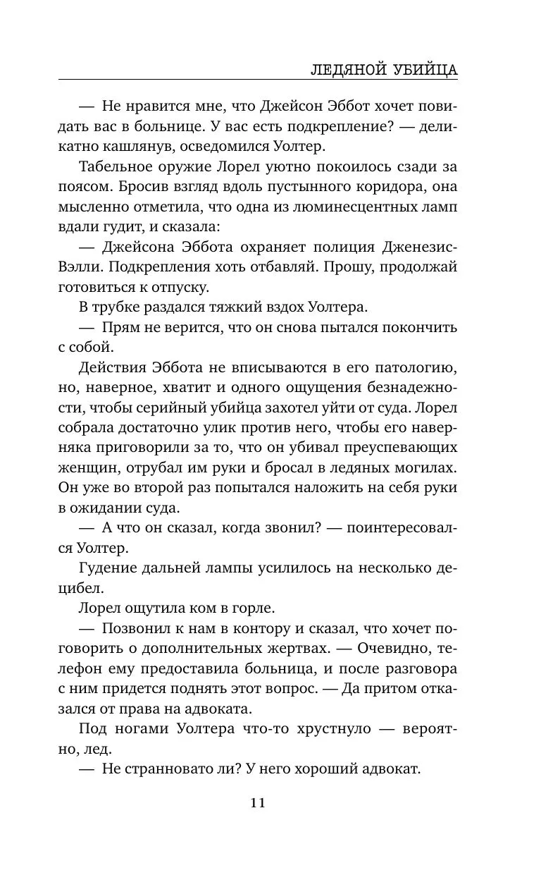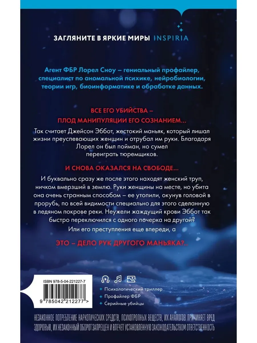 Так считает Джейсон Эббот, жестокий маньяк, который лишал жизни преуспевающих женщин и отрубал им руки. Благодаря Лорен он был пойман, но сумел переиграть тюремщиков И СНОВА ОКАЗАЛСЯ НА СВОБОДЕ… И буквально сразу же после этого находят женский труп, ничком вмерзший в землю. Руки женщины на месте, но убита она очень странным способом — ее утопили, окунув головой в прорубь, по всей видимости, специально для этого сделанную в ледяном покрове реки. Неужели жаждущий крови Эббот так быстро переключился с одного почерка на другой?