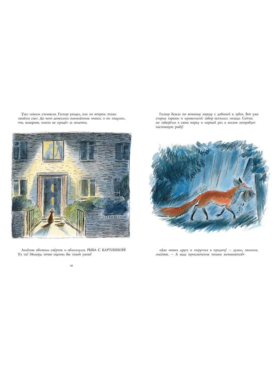 Однажды лисенок со звучным именем Гаспар отправляется добывать себе ужин, стараясь, как обычно, не попадаться людям на глаза. По дороге он встречает ученого кота Милорда, который советует ему порыскать на набережной. Там Гаспар знакомится с маленькой, но бесстрашной собачкой Финти. Она показывает ему, где водятся вкусные сосиски, а потом помогает выбраться из канала, куда он свалился, удирая от хозяина кафе. Распрощавшись с Финти, Гаспар крадется по темным улицам и видит, как один Нестрашный Человек с добрыми глазами и рыжими волосами случайно роняет из рук пакет с едой. Так буквально за один вечер жизнь лиса-одиночки круто меняется: он впервые в жизни пробует настоящую рыбу и обретает сразу двоих друзей!