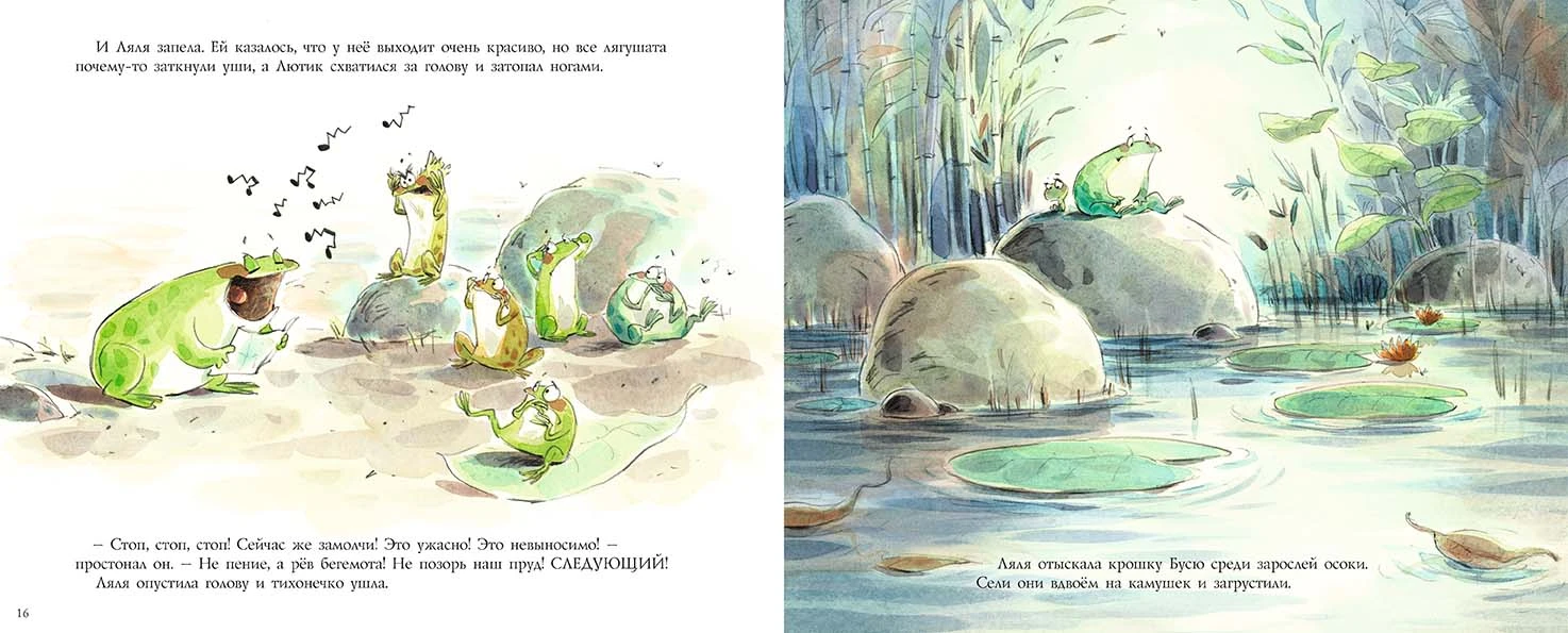Присоединиться к лягушачьему хору – мечта каждой лягушки. У малютки Буси прекрасный голос, но она не вышла росточком, и хормейстер Лютик не рискнул взять её в хор, пока Буся не подрастёт. Ляля статная, заметная, но со слухом и голосом у неё большие проблемы: стоило ей только начать петь, как все вокруг заткнули уши и разбежались в разные стороны.