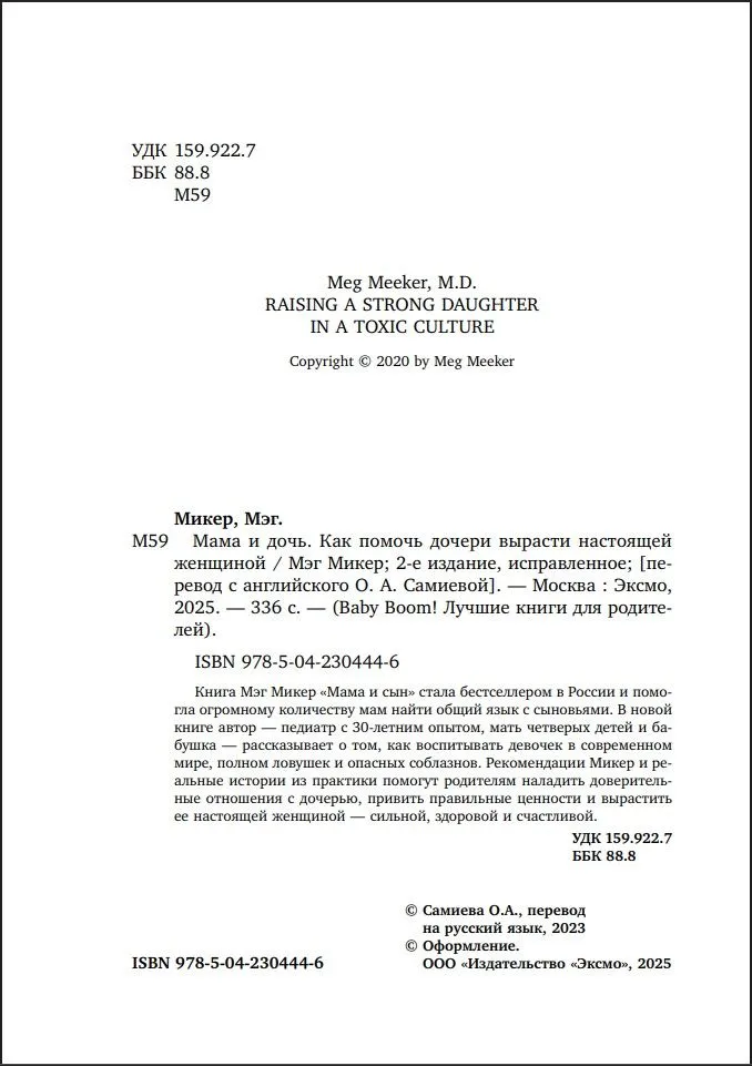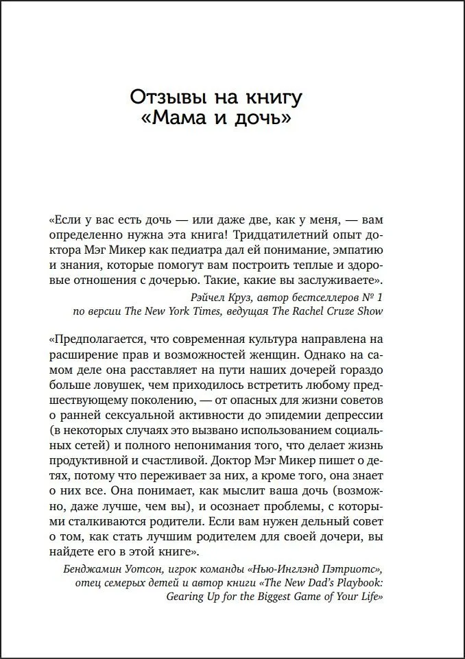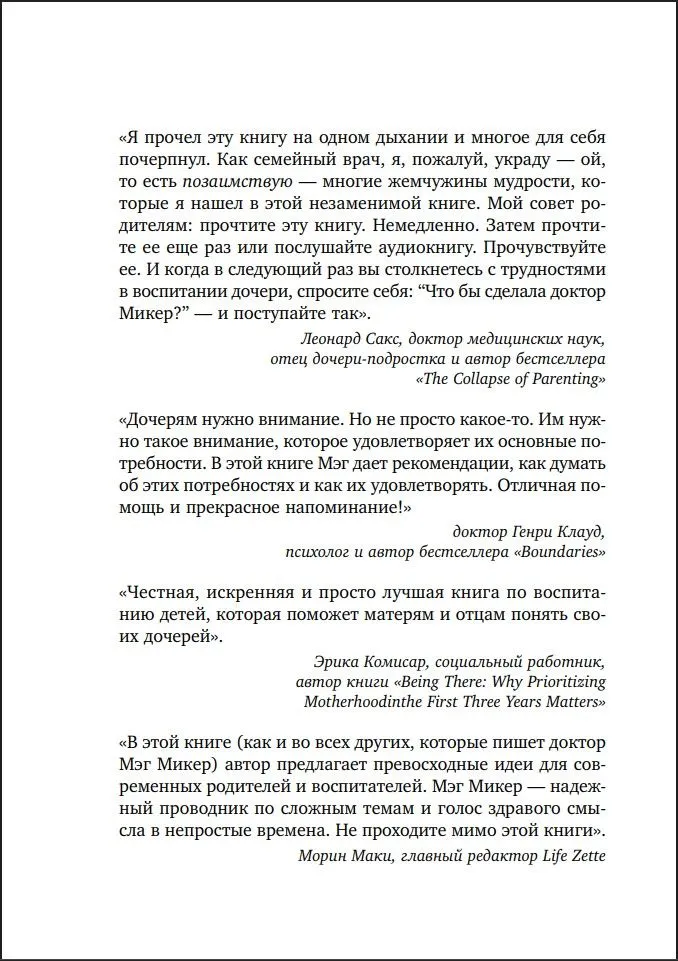 Мэг Микер, педиатр с 30-летним опытом, автор бестселлеров, мама и бабушка, делится знанием о том, как вырастить дочь здоровой и счастливой женщиной - и уберечь ее от бед и соблазнов. Она предлагает систему воспитания из 11 шагов, которая поможет родителям научиться лучше понимать свою дочь, наладить доверительные отношения и привить ей правильные ценности.