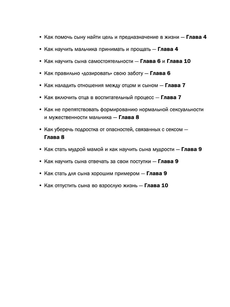 Мама – главная женщина в жизни мальчика. Именно мама должна помочь сыну найти цель и предназначение в жизни, научиться понимать и прощать, стать самостоятельным и нести ответственность за свои поступки. И мамам, конечно, нелегко. Как найти правильные слова и поддержать в сложной ситуации? Как стать хорошим примером? Как научиться выражать свою любовь и поддержку, а в нужный момент с легким сердцем отпустить сына во взрослую жизнь? Каждая мама мальчика ежедневно решает множество задач, связанных с воспитанием мужчины. И книга Мэг Микер призвана помочь им в этом непростом, но важном деле.