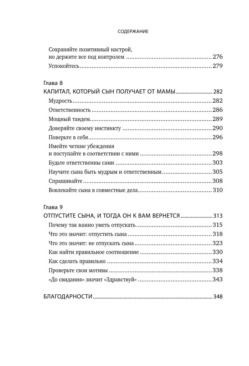 Книга делает акцент на самых главных вопросах в жизни мамы и сына. Любовь и поддержка, забота и независимость, противостояния и конфликты — всем этим темам уделено самое пристальное внимание. Отдельно автор говорит о том, как включить отца в воспитательный процесс, как уберечь подростка от опасностей, связанных с сексом, как обеспечить ребенку мужское внимание, если он растет без отца.