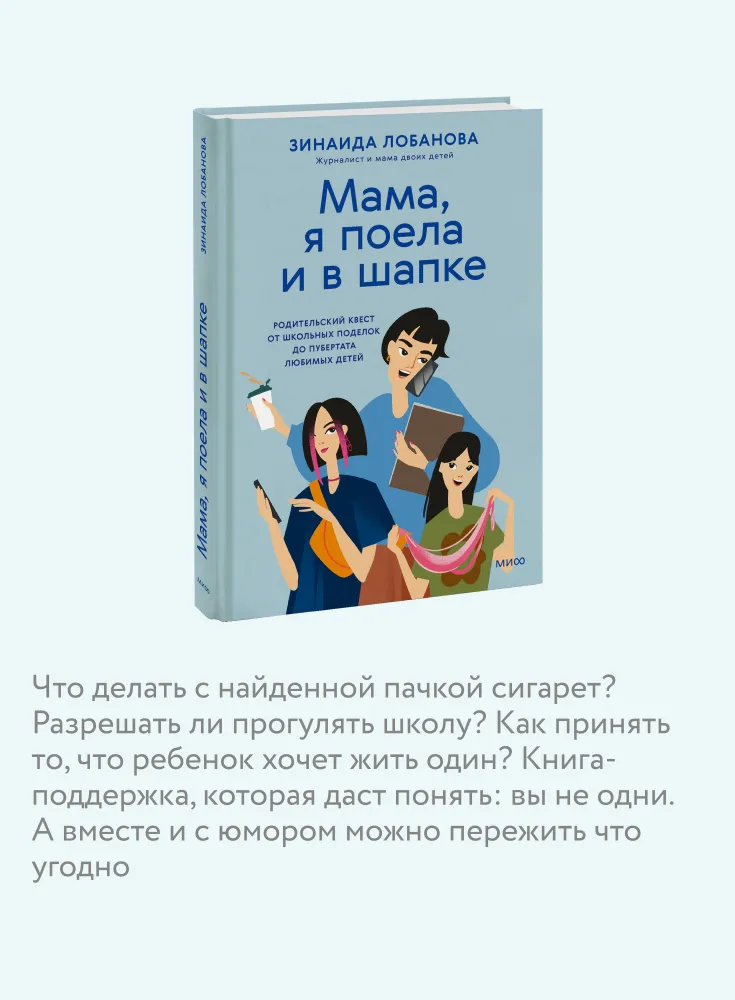«Мама, я поела и в шапке. Родительский квест от школьных поделок до пубертата любимых детей» — книга поддержки для родителей подростков от Зинаиды Лобановой, мамы двух дочек, журналиста и сторителлера. Как поступить, если нашёл у подростка пачку сигарет? Стоит ли разрешать прогулять школу и как принять факт взросления ребёнка, который хочет жить отдельно? В этой книге — честные ответы на самые острые вопросы воспитания и трогательные истории о буднях родителей и жизни с подростками.