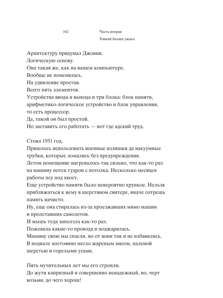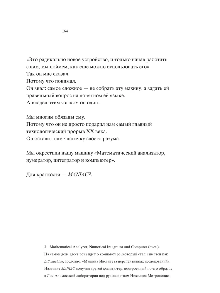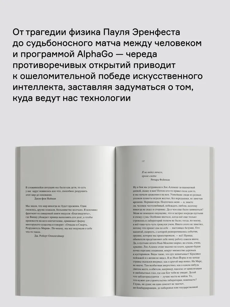 Центральное место автор отводит биографии математика-вундеркинда Джона фон Неймана, участника Манхэттенского проекта и создателя архитектуры вычислительных машин, на основе которой был построен один из первых компьютеров — MANIAC. История фон Неймана предваряется рассказом о трагической судьбе Пауля Эренфеста, а последние главы посвящены судьбоносному турниру по игре го между Ли Седолем и программой AlphaGo. Череда противоречивых событий из мира науки — от создания водородной бомбы до рождения суперкомпьютеров, — вызывающих восторг у одних и вселяющих ужас в других, завершается ошеломительной победой искусственного интеллекта над человеком, заставляя читателей задуматься о том, куда нас привели и приведут технологии.