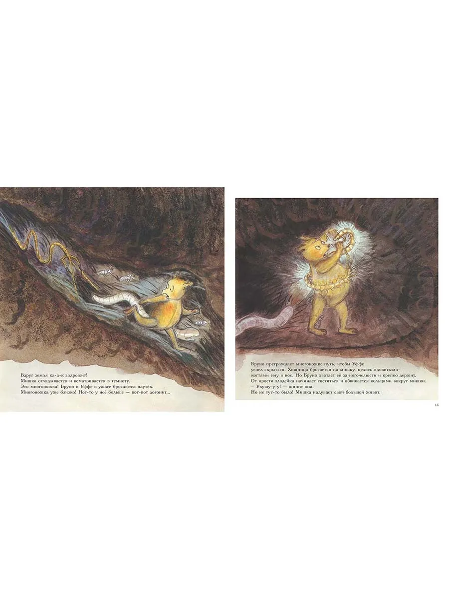 В первой истории мишка Бруно гуляет по саду и замечает на грядке с редиской странную кучку земли. Отодвинув ее лапой, он видит подземный ход. Вот бы туда проникнуть! Любознательный мишка, когда захочет, может делаться маленьким. Как? Это его секрет! Став мишкой-крошкой, он скатывается под землю и падает прямо на дождевого червяка Уффе. Когда Уффе приходит в себя от потрясения, он показывает мишке свои владения и знакомит со своими друзьями ногохвостками. А мишка спасает червяка от свирепой многоножки и помогает ему пополнить запасы еды. Свои наблюдения мишка потом аккуратно заносит в дневник. Мишкины записки и рисунки занимают четыре страницы: подземные владения Уффе в разрезе, образ жизни дождевых червей, строение тела и способ размножения, их друзья и враги, а также польза, которую они приносят саду.