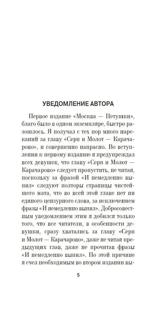 Поэма «Москва — Петушки» была написана в 1969 году, впервые опубликована в России в 1988–1989 годах в журнале «Трезвость и культура». С тех пор поэма издавалась неоднократно и была переведена на многие языки.