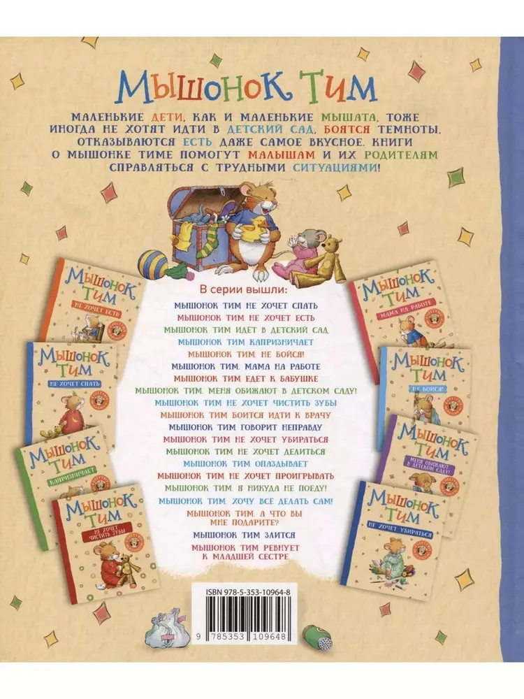 Серия «Мышонок Тим» — это более 15 поучительных историй, которые помогают детям адаптироваться к детскому саду, подружиться с горшком и научиться слушаться родителей.