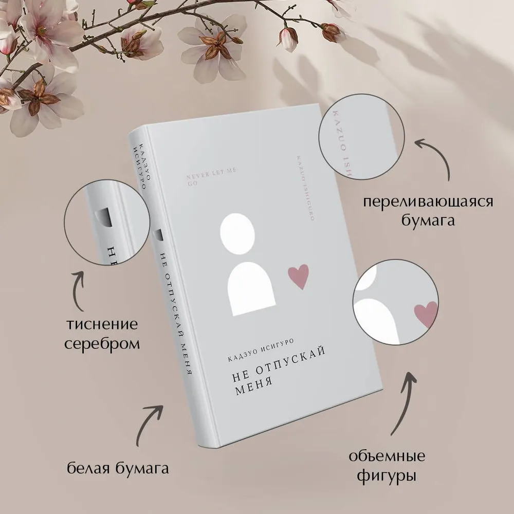 По мотивам книги в 2010 году вышел одноименный фильм с Кирой Найтли и Эндрю Гарфилдом в главных ролях. Роман «Не отпускай меня» встал на одну полку с такими культовыми антиутопиями, как «О дивный новый мир» Олдоса Хаксли и «Мы» Евгения Замятина. Также легко представить, что подобный сюжет, как у Исигуро, мог бы появиться в сериале «Черное зеркало». Оформление обложки вдохновлено стилями "тихая роскошь" и "old money". Минималистичная серия "Жемчужина. Классика тихой роскоши" создается как изящное дополнение к культовым образам принцессы Дианы и Жаклин Кеннеди. Эти книги могут довершить стильный образ успешной девушки, а также стать частью интерьера квартиры, ресторана, гостиницы и других пространств. Благодаря металлизированной бумаге, создается эффект свечения обложки. Краски мягко и тихо переливаются. На корешке символ книги сделан тиснением серебром, что усиливает эффект внутреннего света. Объемное тиснение фигур создает приятное тактильное ощущение. Текст напечатан на белой бумаге, мягкой на ощупь. Для серии подобран крупный и удобный шрифт, от которого не устанут глаза.