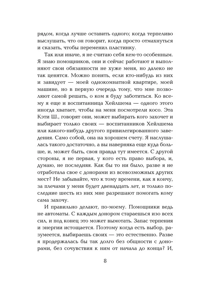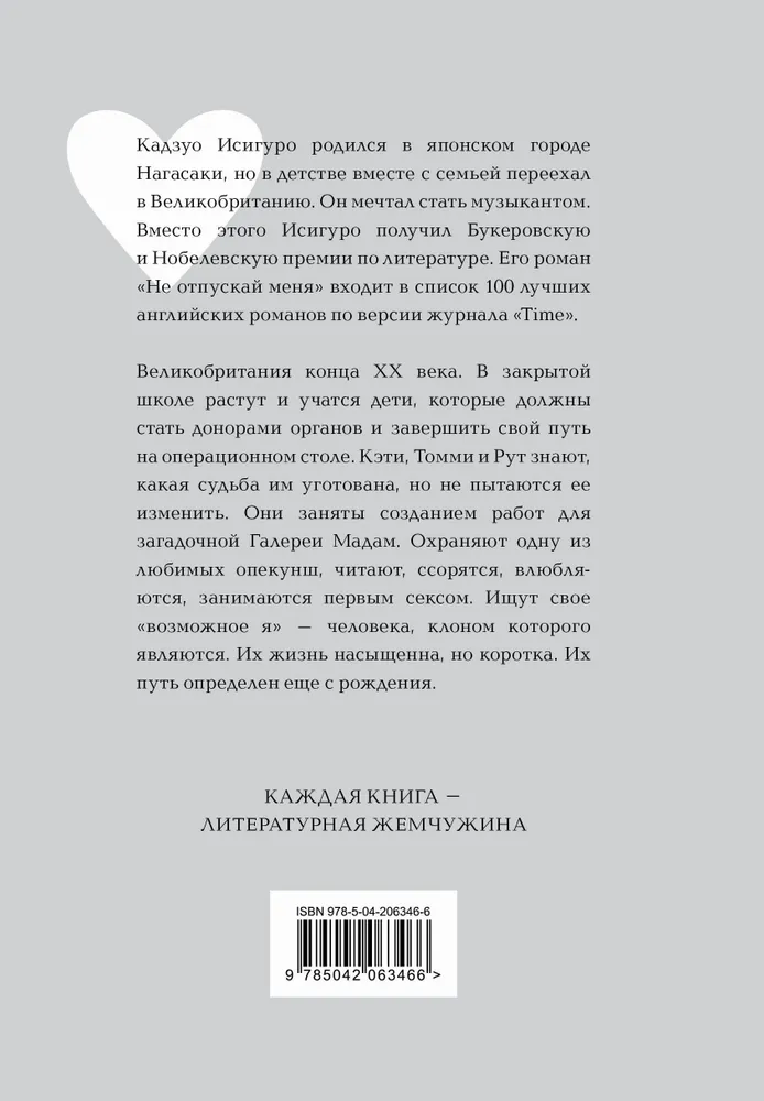 Кадзуо Исигуро родился в японском городе Нагасаки, но в детстве вместе с семьей переехал в Великобританию. Он мечтал стать музыкантом. Вместо этого Исигуро получил Букеровскую и Нобелевскую премию по литературе. Критики его часто сравнивали с Владимиром Набоковым – оба автора стали классиками и при этом писали свои шедевры на неродном языке. «Не отпускай меня» входит в список 100 лучших английских романов по версии журнала «Time». Антиутопическая Великобритания конца XX века. В закрытой школе растут и учатся дети, которые должны стать донорами органов и завершить свой путь на операционном столе. Кэти, Томми и Рут знают, какая судьба им уготована, но не пытаются ее изменить. Они заняты созданием работ для загадочной Галереи Мадам. Охраняют одну из любимых опекунш, читают, ссорятся, влюбляются, занимаются первым сексом. Ищут свое «возможное я» – человека, клоном которого являются. Их жизнь насыщена, но коротка. Их путь определен еще с рождения.