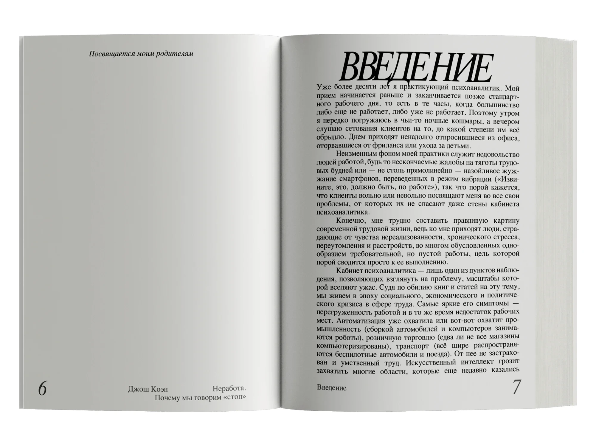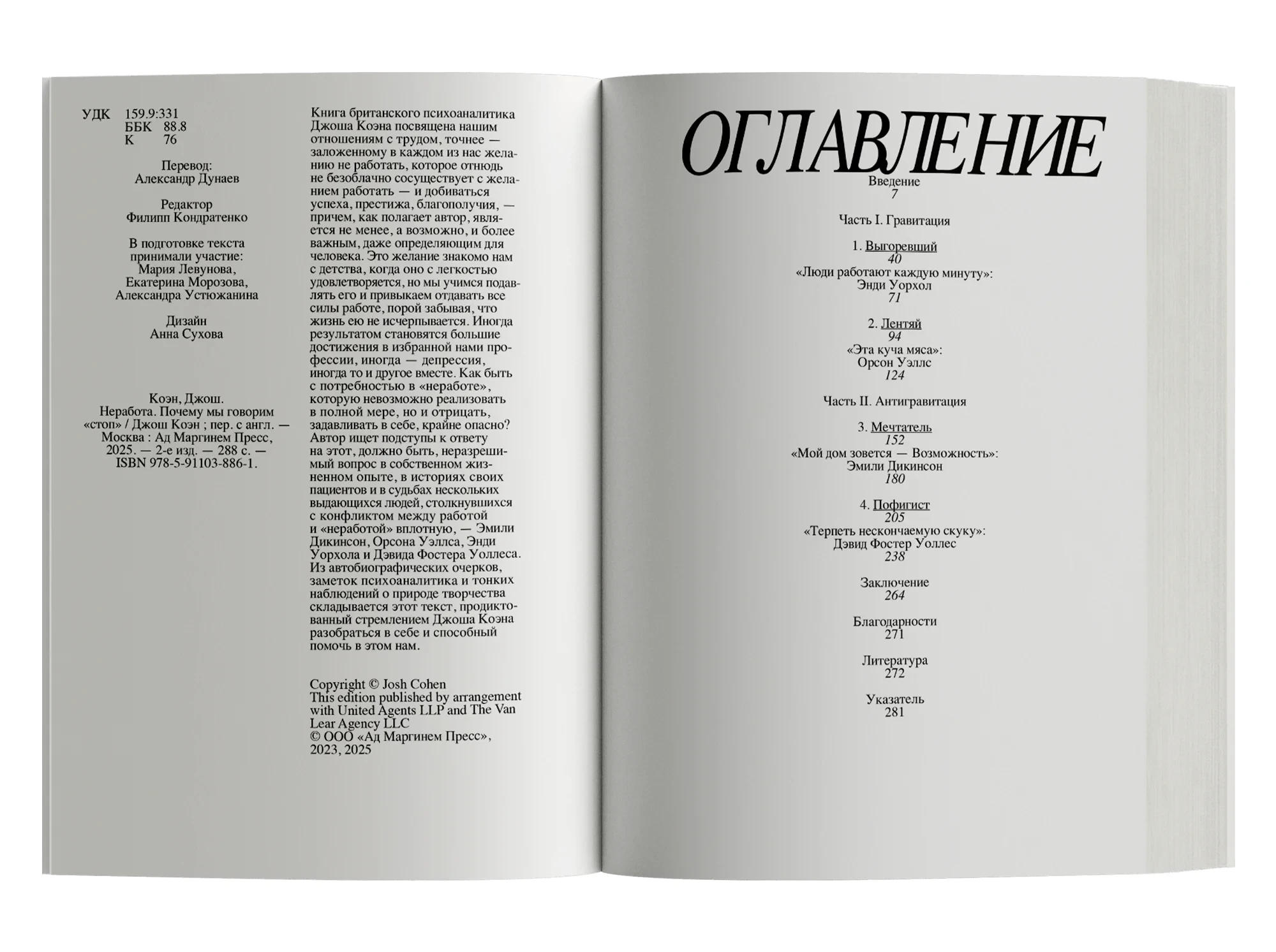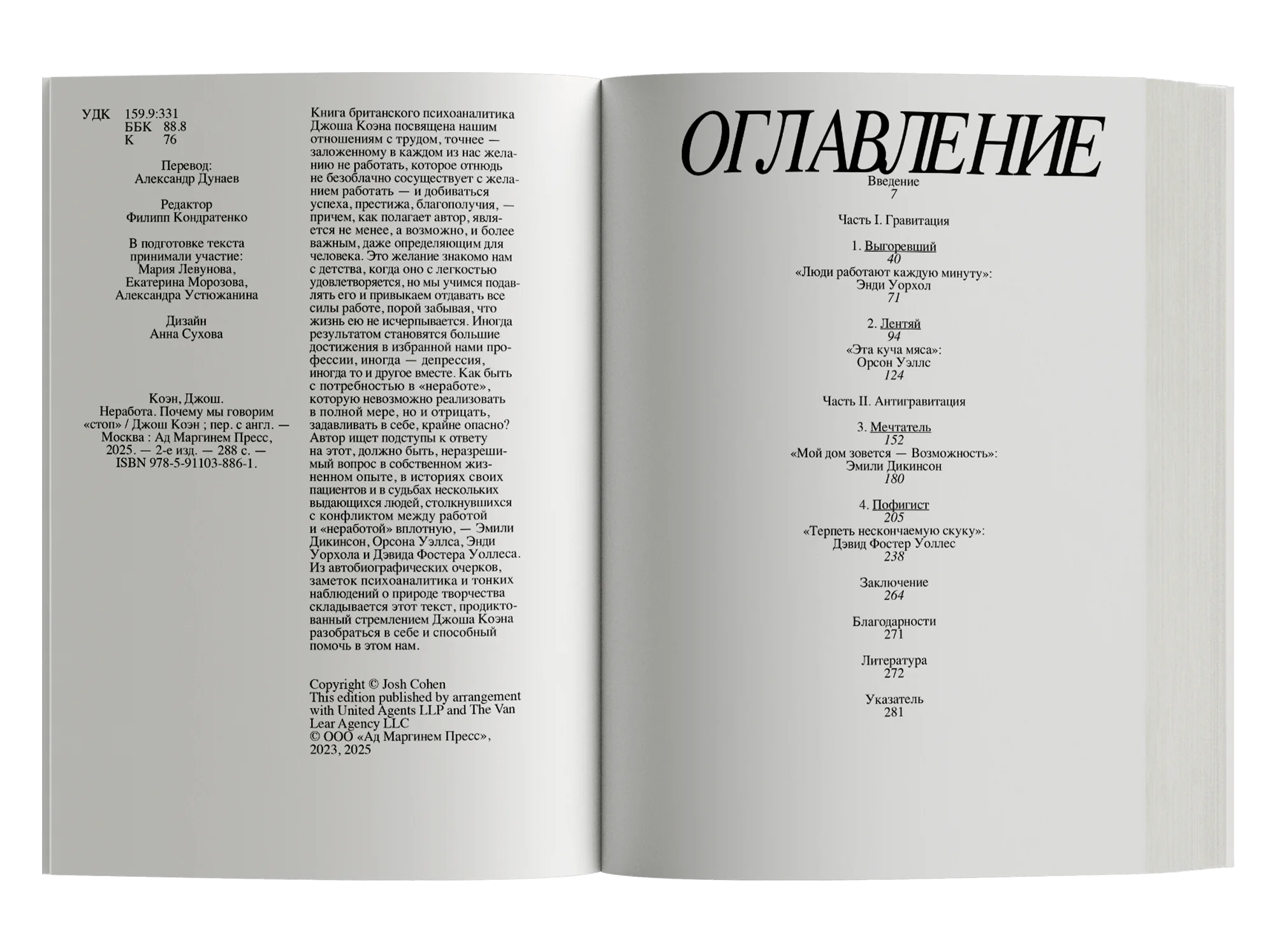 Книга британского психоаналитика Джоша Коэна посвящена нашим отношениям с трудом, точнее — заложенному в каждом из нас желанию не работать, которое отнюдь не безоблачно сосуществует с желанием работать — и добиваться успеха, престижа, благополучия, — причем, как полагает автор, является не менее, а возможно, и более важным, даже определяющим для человека. Это желание знакомо нам с детства, когда оно с легкостью удовлетворяется, но мы учимся подавлять его и привыкаем отдавать все силы работе, порой забывая, что жизнь ею не исчерпывается. Иногда результатом становятся большие достижения в избранной нами профессии, иногда — депрессия, иногда то и другое вместе.