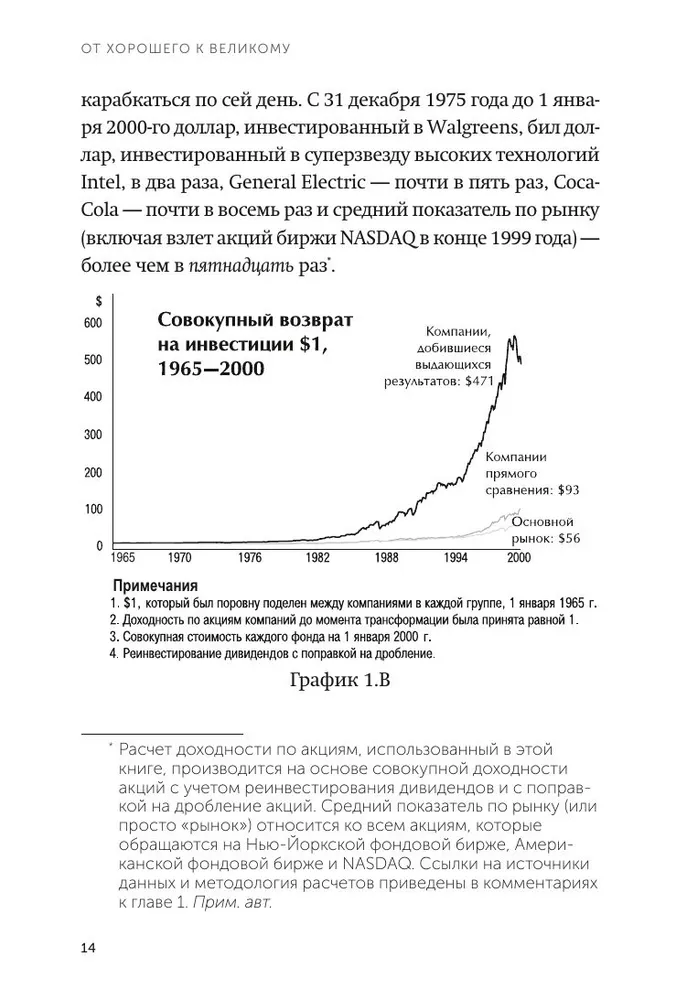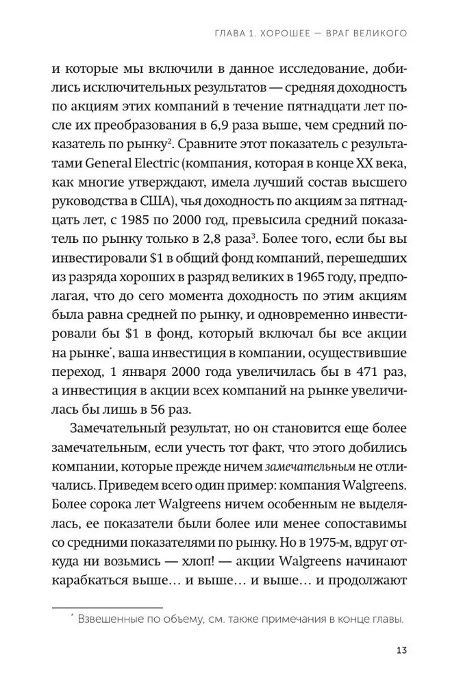 В книге анализируется опыт компаний, осуществивших переход от хороших показателей к выдающимся, таких как: Abbott, Circuit City, Fannie Mae, Gillette, Kimberly-Clark, Kroger, Nucor, Philip Morris, Pitney Bowes, Walgreens, Wells Fargo. Эти компании сохраняли высокие результаты в течение 15 лет. Так, к 2000 г. инвестиции в $1, сделанные в 1965 г. в эти компании, увеличились бы в 471 раз, а инвестиции в акции всех компаний на рынке увеличились бы лишь в 56 раз.