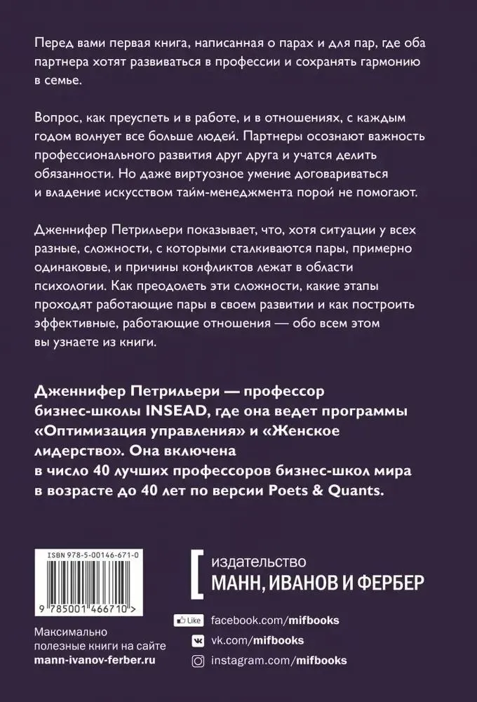 Автор исследует именно эти процессы и предлагает подходы, которые пригодятся многим парам. В книге рассмотрены реальные истории более 40 пар, и некоторые наверняка окажутся близки вашей ситуации. Опыт многих семей поможет найти собственный путь. Если заранее узнать, какие проблемы могут поджидать работающие пары в разные периоды совместной жизни, через какие переходные этапы придется пройти, о чем договариваться и как поддерживать друг друга, партнеры смогут преодолеть все сложности и выстроить гармоничные отношения.