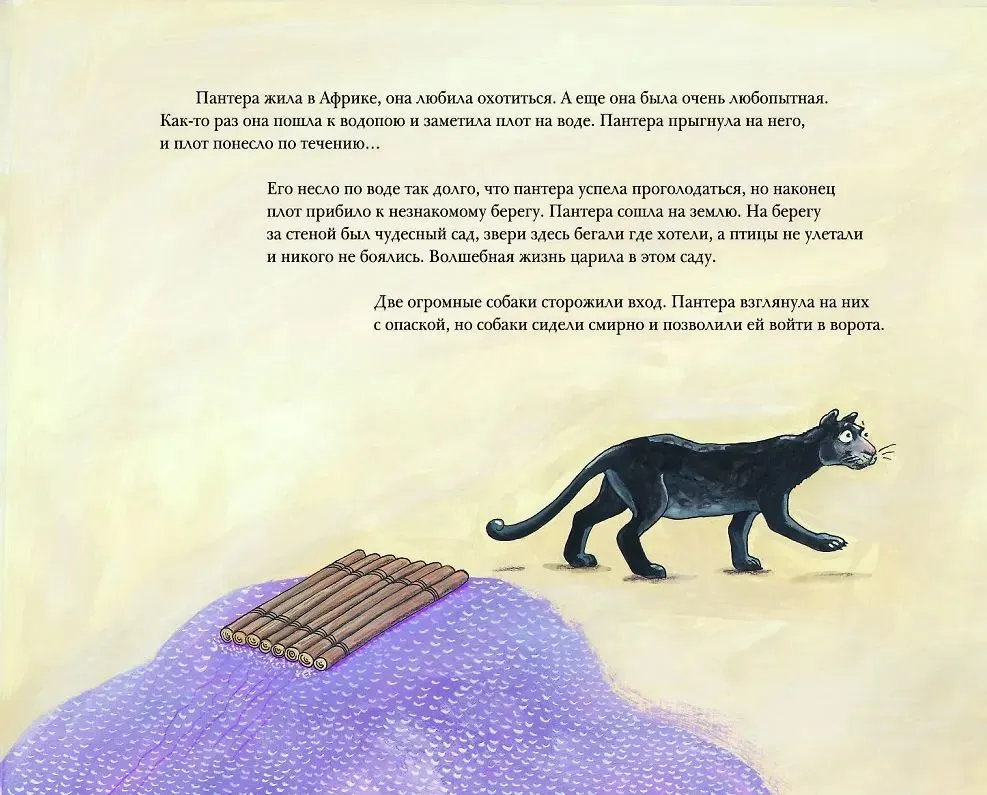 Пантера жила в Африке и обожала охотиться. А еще она была очень любопытна и однажды оказалась в чудесном саду, где звери живут в мире и согласии и не едят друг друга. Однако такая райская жизнь пришлась охотнице не по вкусу, так же, как и соевые антилопы.